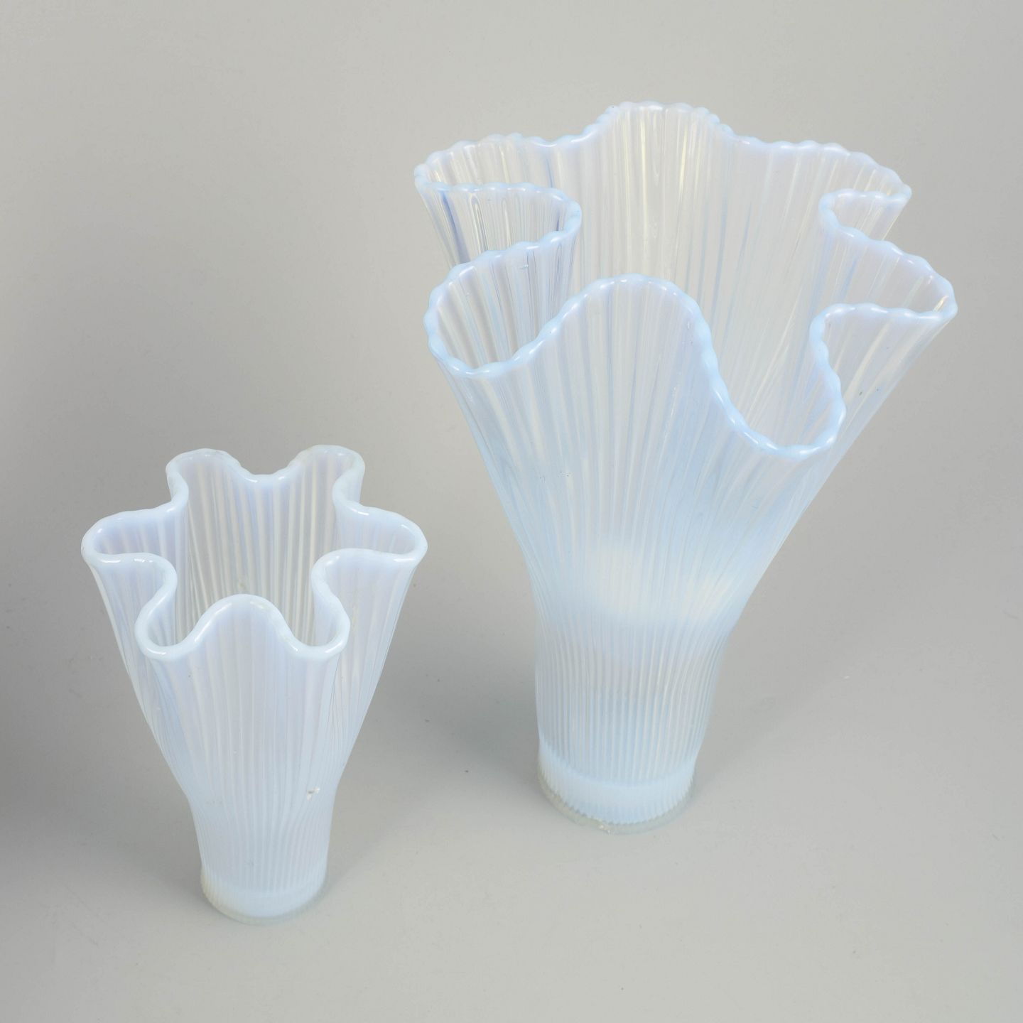 To mundblæste vaser i opaliseret glas fra serien “Reffla”, designet af Arthur Percy for Gullaskruf. Serien er kendetegnet ved sine elegante riflede sider og bølgende kanter, der fanger lyset smukt i det halvtransparente glas.