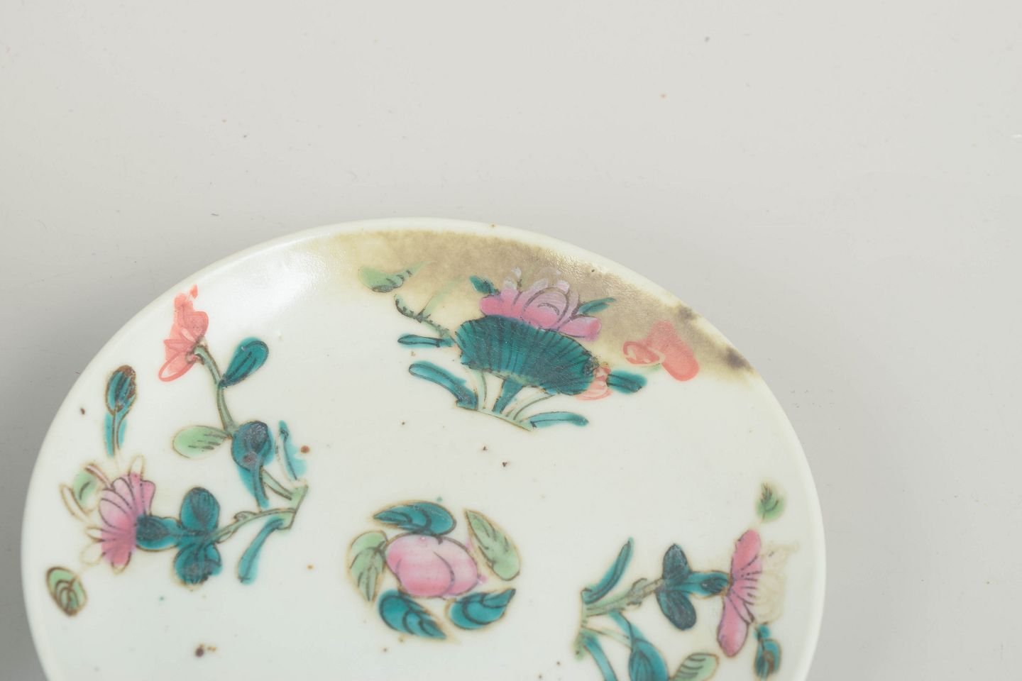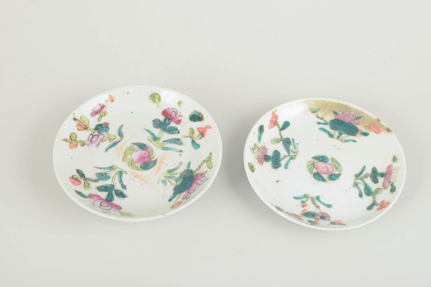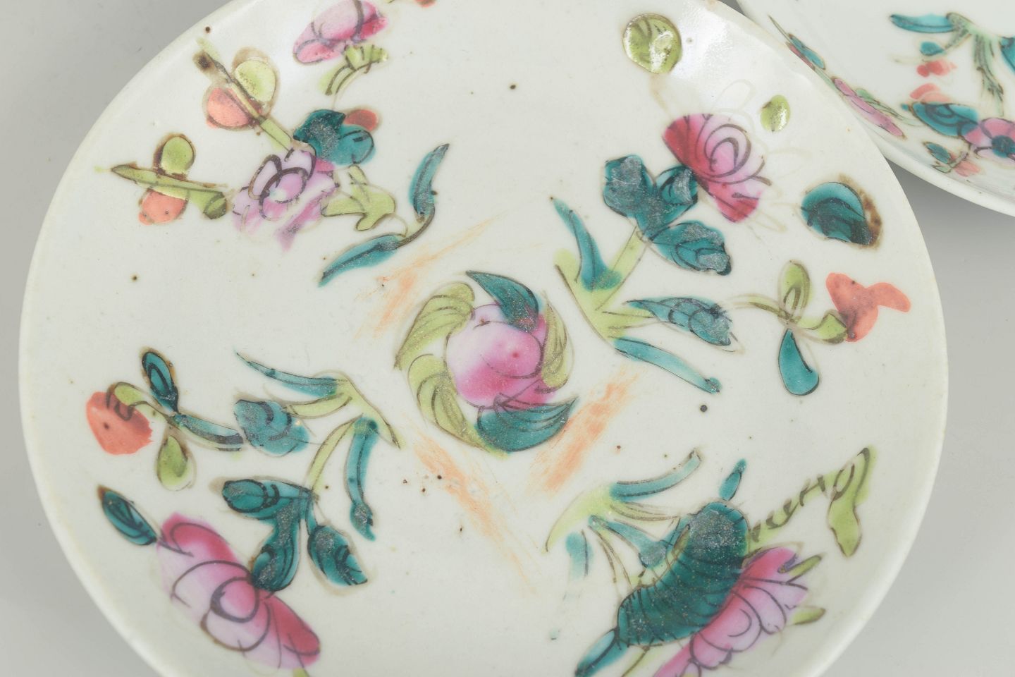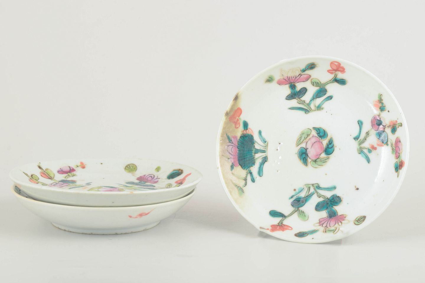 Tre små tallerkener i hvidt porcelæn dekoreret i famille rose-paletten med håndmalede blomster og bladmotiver i rosa, grønne og turkise nuancer. Typisk for Qing-dynastiets dekorative stil med levende farver og delikate penselstrøg.