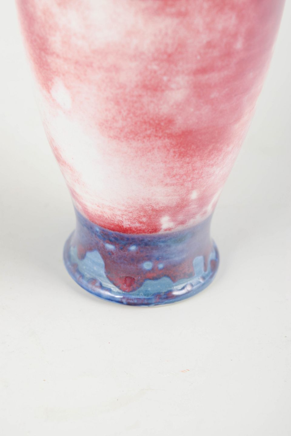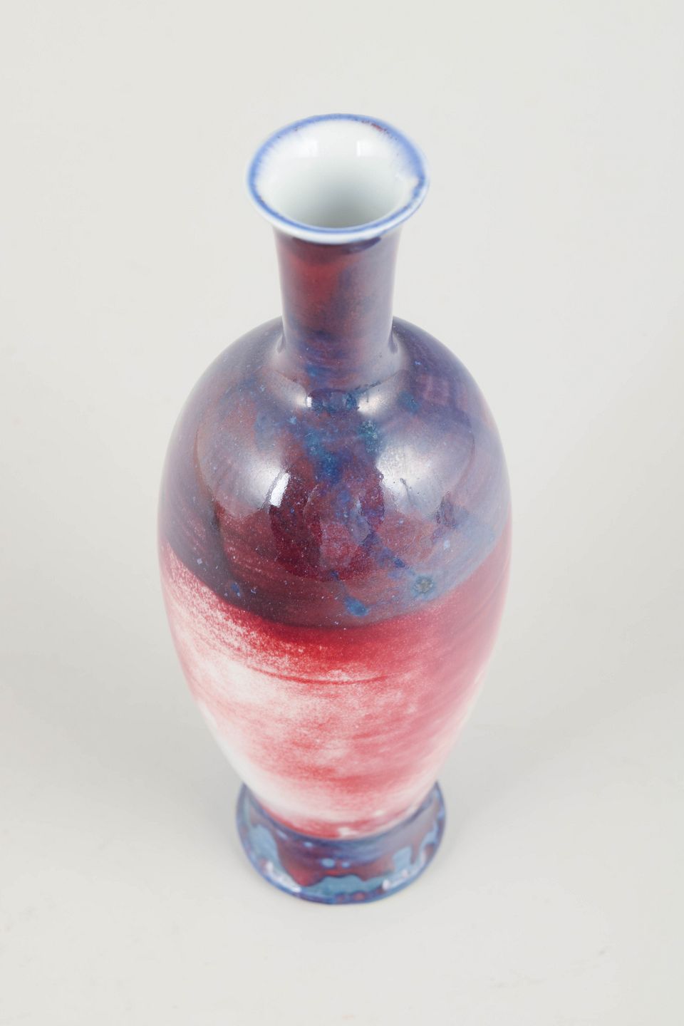 Elegant cylindrisk vase i porcelæn med eksperimenterende prøveglasur i røde, hvide og blå toner. Høj, slank form med afrundet fod og smallende hals. Et unikaeksemplar fra Rörstrands atelier, udført som del af glasurtests i midten af 1980’erne.