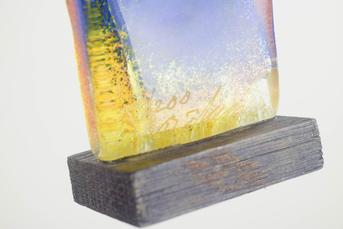 Svensk glaskunstskulptur med ansigtsmotiv i blå, gule og orange nuancer. Udført i støbt glas med en mat, krystallinsk overflade og monteret på sort træfod.
