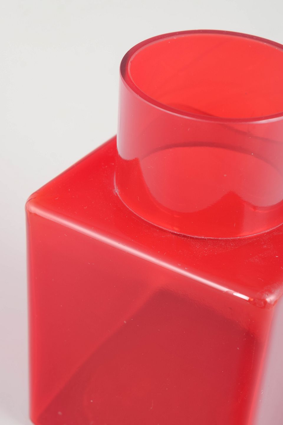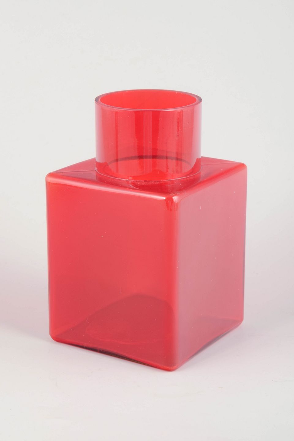 Geometrisk formet vase i klart rødligt glas med cylindrisk hals og firkantet korpus – et karakteristisk eksempel på italiensk Murano-design fra perioden.