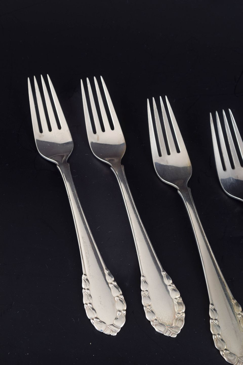 Sæt med fem middagsgafler i sterlingsølv fra Georg Jensen i det klassiske “Liljekonval”-mønster. Elegant udført med bløde linjer og blomsterornamentik i art deco-stil. Stemplet “GEORG JENSEN STERLING DENMARK”.