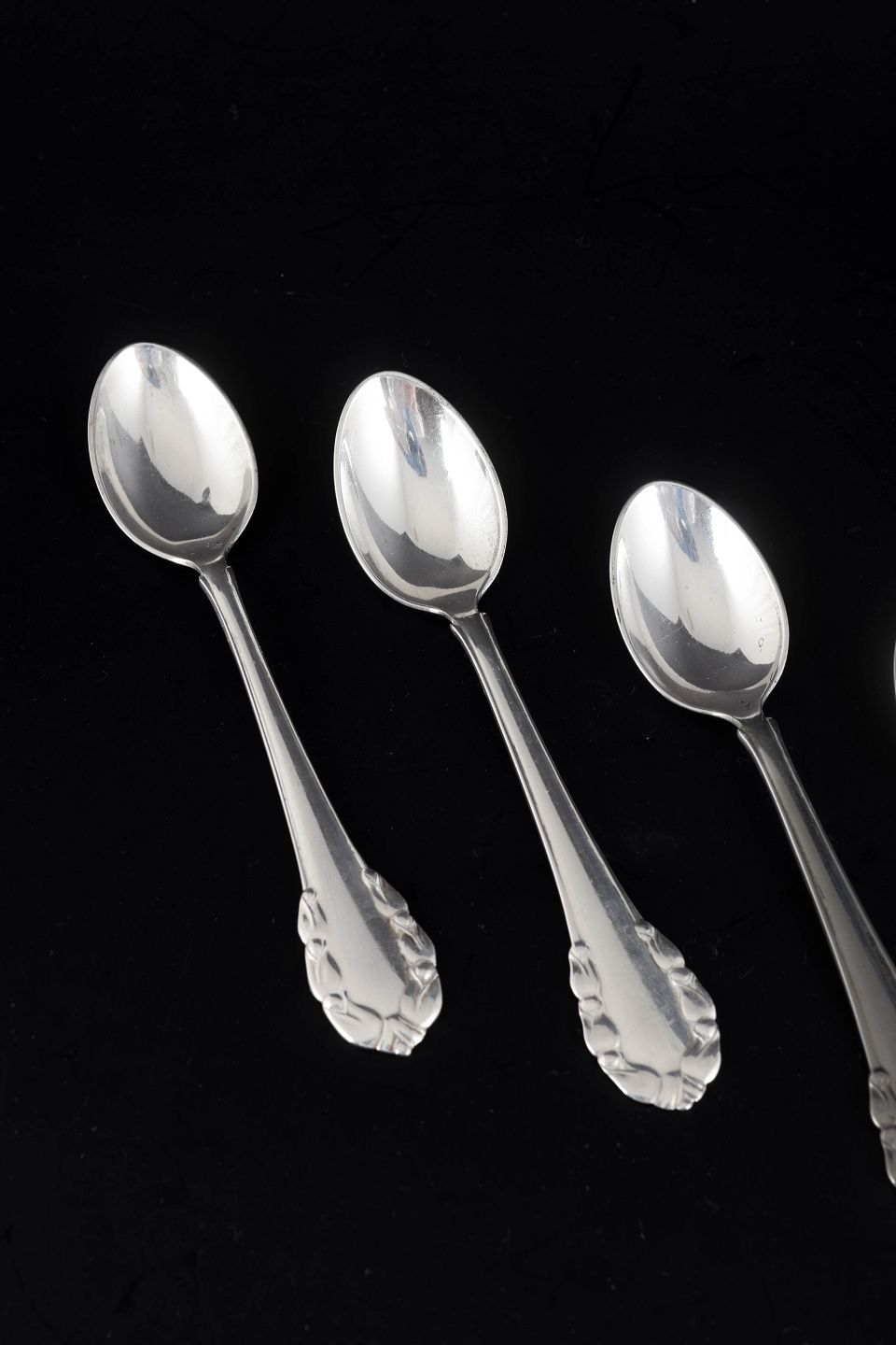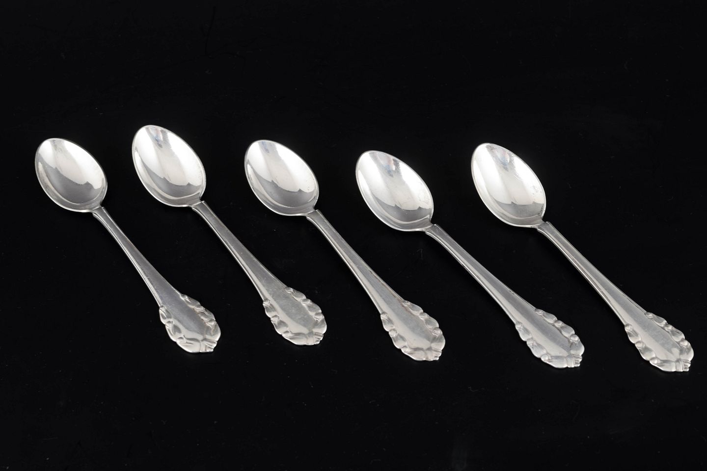 Sæt med fem små kaffeskefter i sterlingsølv fra Georg Jensen i det klassiske “Liljekonval”-mønster. Elegant udført med afrundede linjer og blomsterornamentik i art deco-stil. Stemplet med sølvmærker og “Georg Jensen”.
