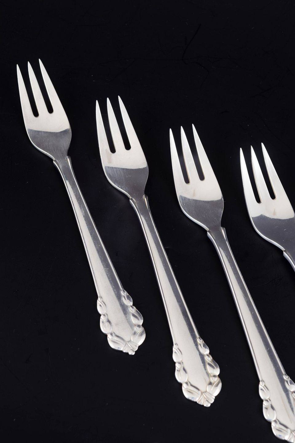 Sæt med fem fiskegafler i sterlingsølv fra Georg Jensen i det klassiske “Liljekonval”-mønster. Elegant udført med afrundede linjer og blomsterornamentik i art deco-stil. Gaflerne stemplet “GEORG JENSEN STERLING DENMARK”.