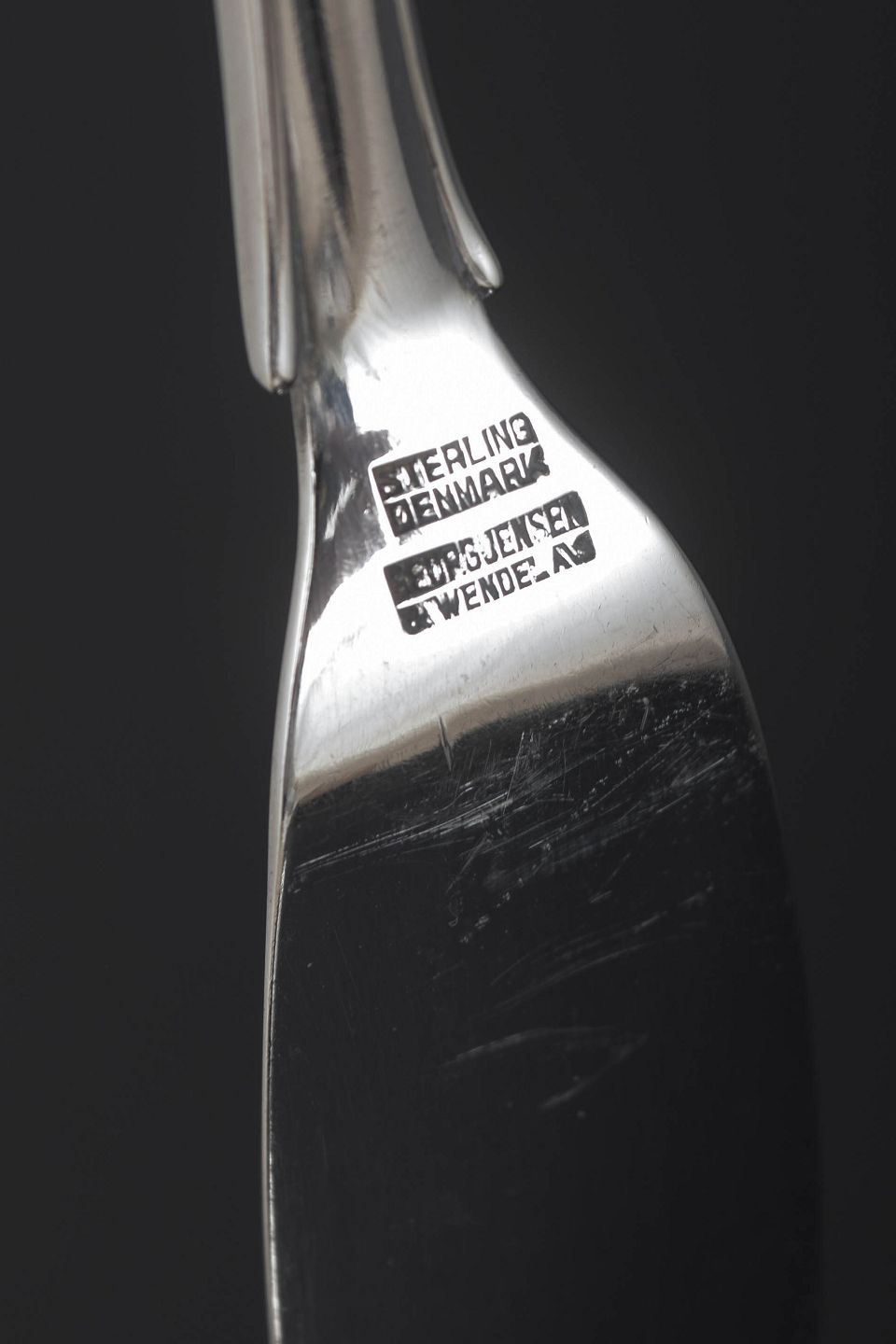 Sæt med fem fiskeknive i sterlingsølv fra Georg Jensen i det klassiske “Liljekonval”-mønster. Elegant udført med bløde linjer og blomsterornamentik i art deco-stil. Klingerne stemplet “GEORG JENSEN STERLING DENMARK”.