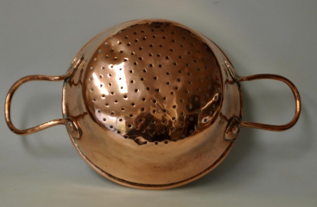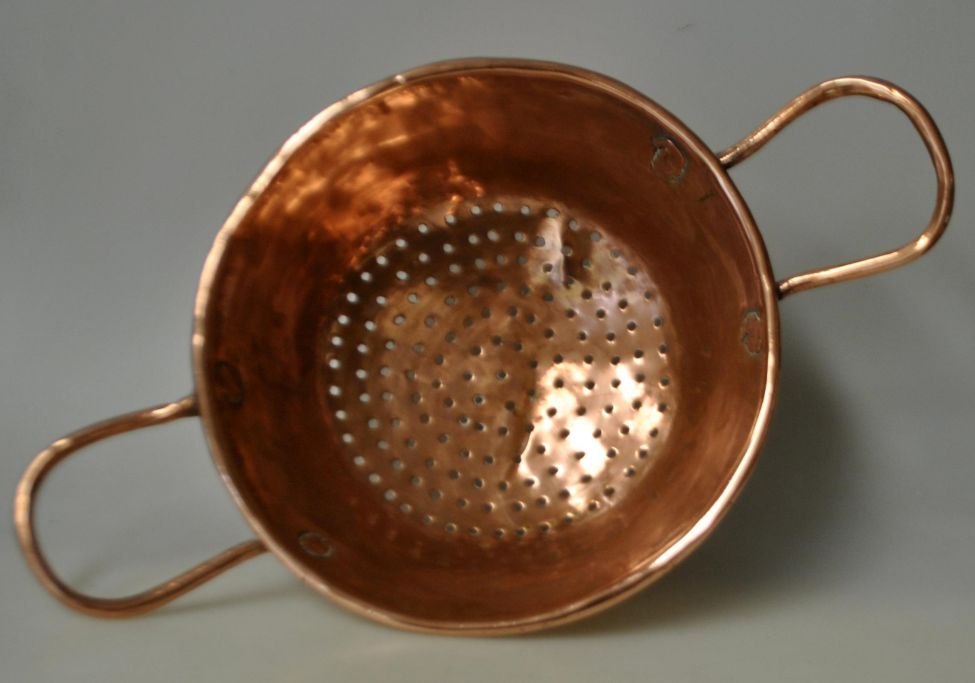 Kupfersieb, 19. Jahrhundert. Dänemark. Ohne Stempel. L: 35 cm. H: 9 cm. Durchmesser: 21 cm.