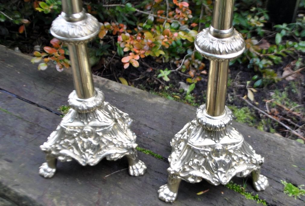 Paar französische Kirchenleuchter aus Messing, 19. Jahrhundert. Mit Löwenfüßen. Sockel mit Engeln. Höhe: 40 cm.