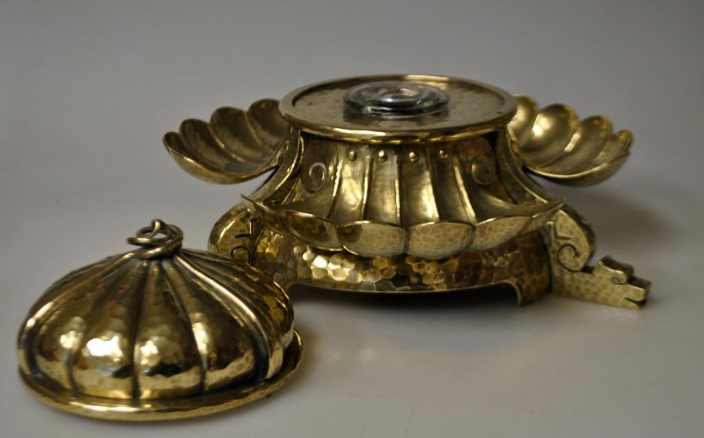 Großes Tintenfass aus Messing, Art déco, um 1920, Dänemark. Mit Drachenfüßen. Gehämmert. Innen: Tintenfass aus Glas. Höhe: 14 cm. Durchmesser: 22 cm.