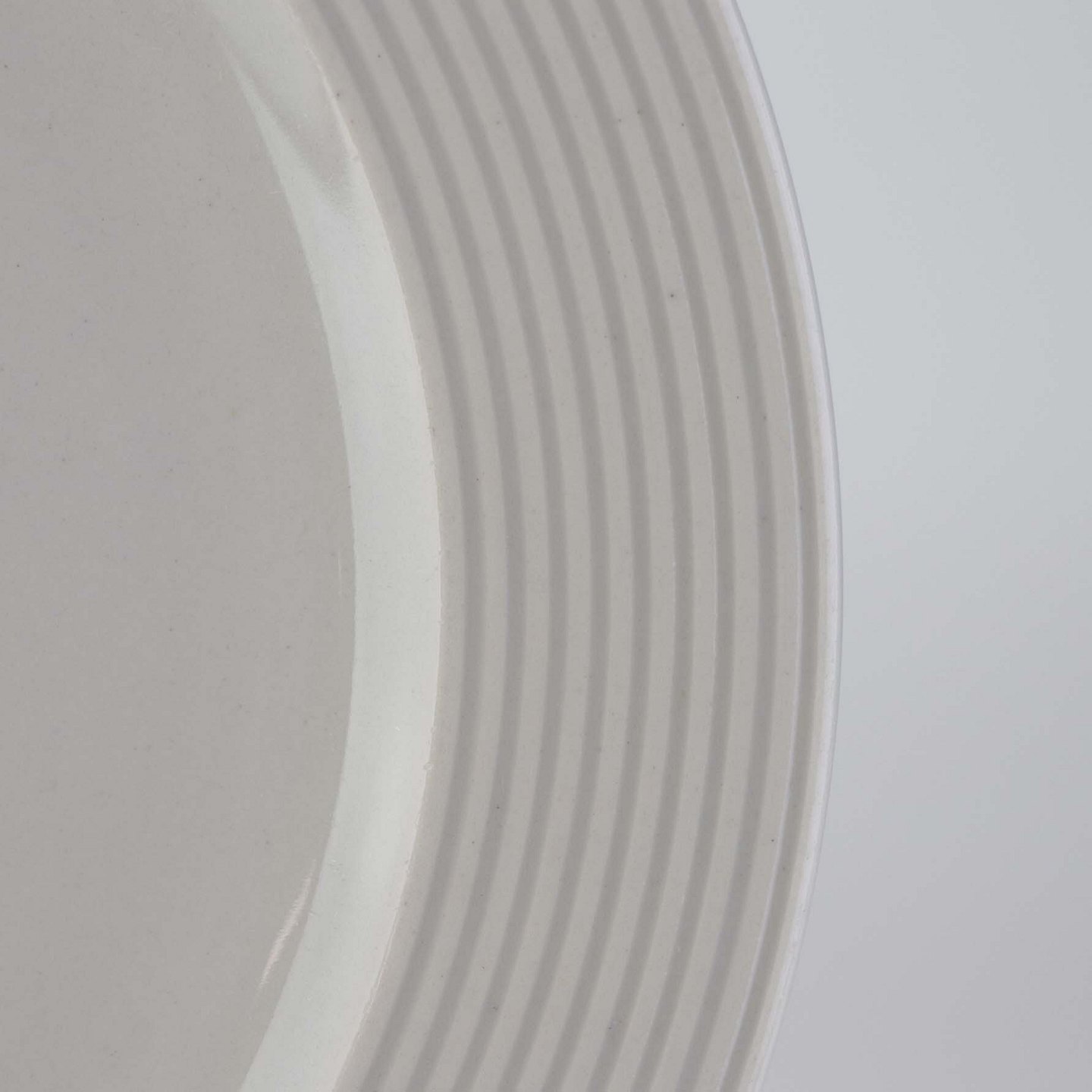 Enkelt stel i stentøj med råhvid glasering og riller i fane.