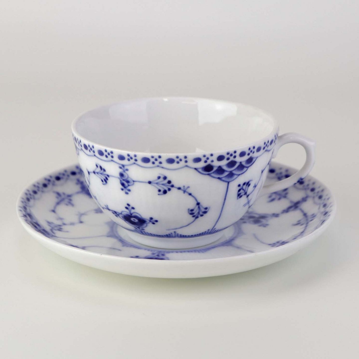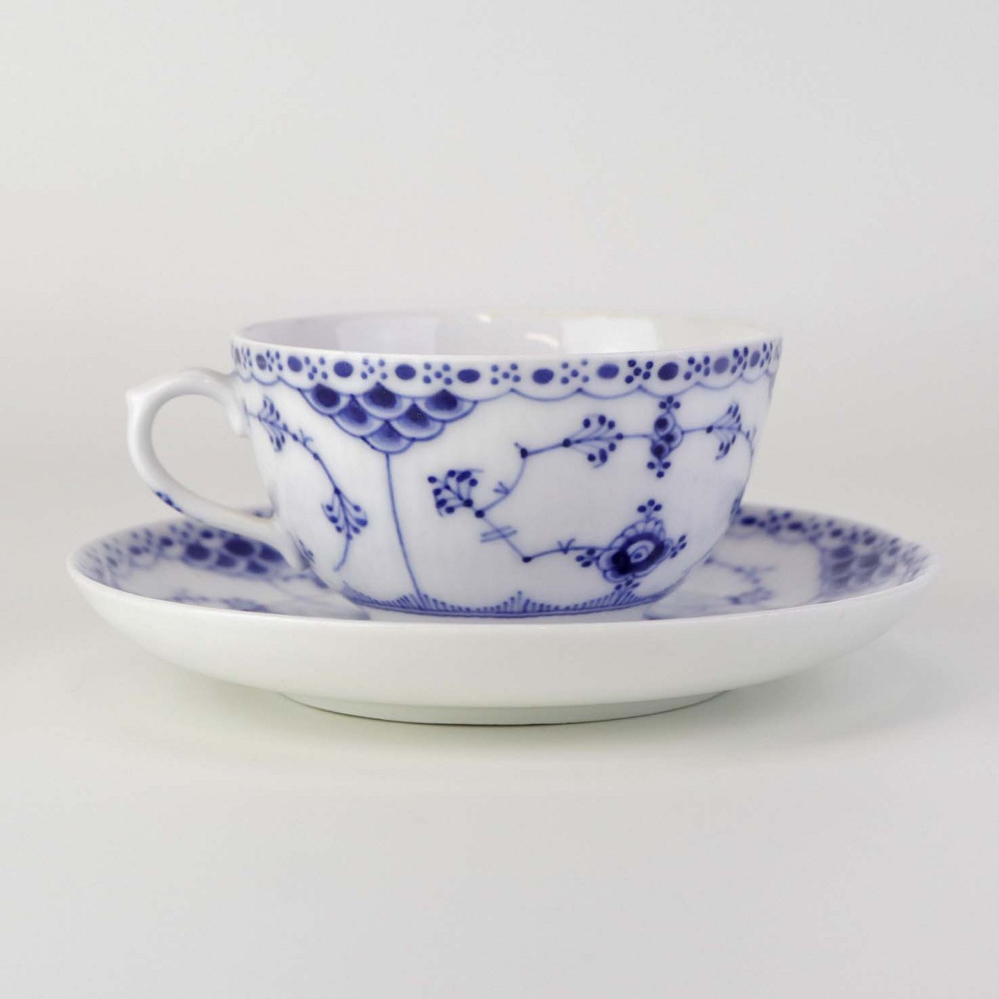 Mellemstor tekop med underkop i kongeligt porcelæn fra stellet Musselmalet Halvblonde. Nr. 1/713