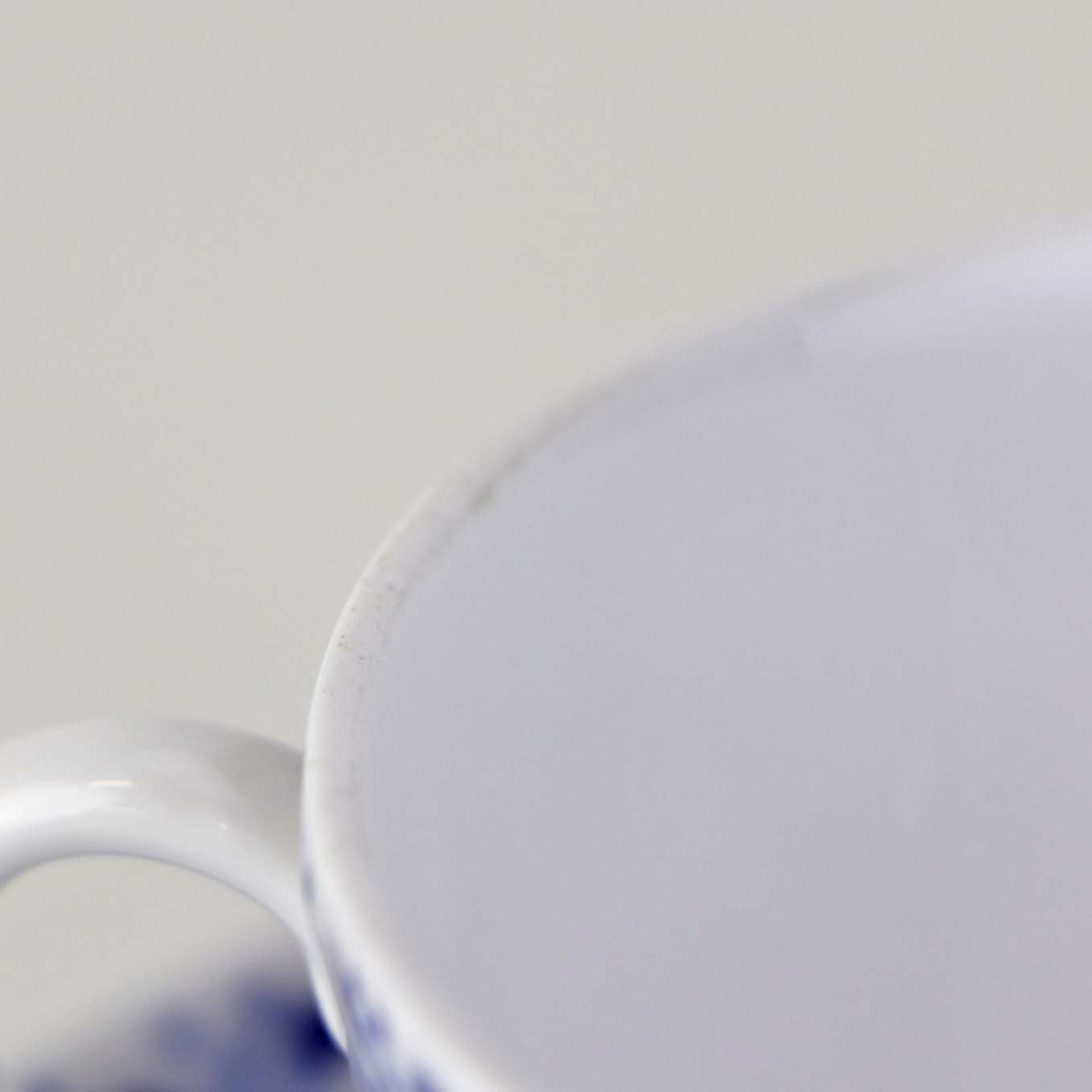 Fremstår med mindre brugsspor på koppens topkant samt to blå prikker på underkoppens bagside.