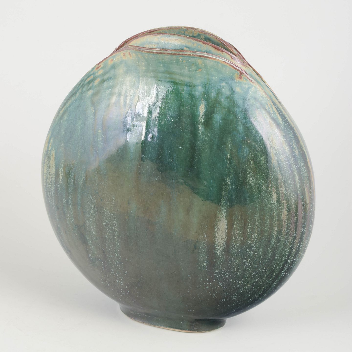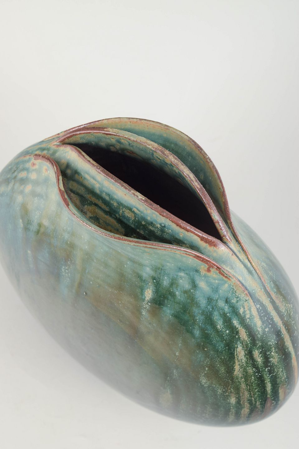 Stor, skulpturel vase i stentøj med markant organisk form og en dobbeltåbning, der giver værket en nærmest biomorf karakter. Glasuren er udført i dybe grønne, turkise og jordagtige toner med subtile løbere og variationer.