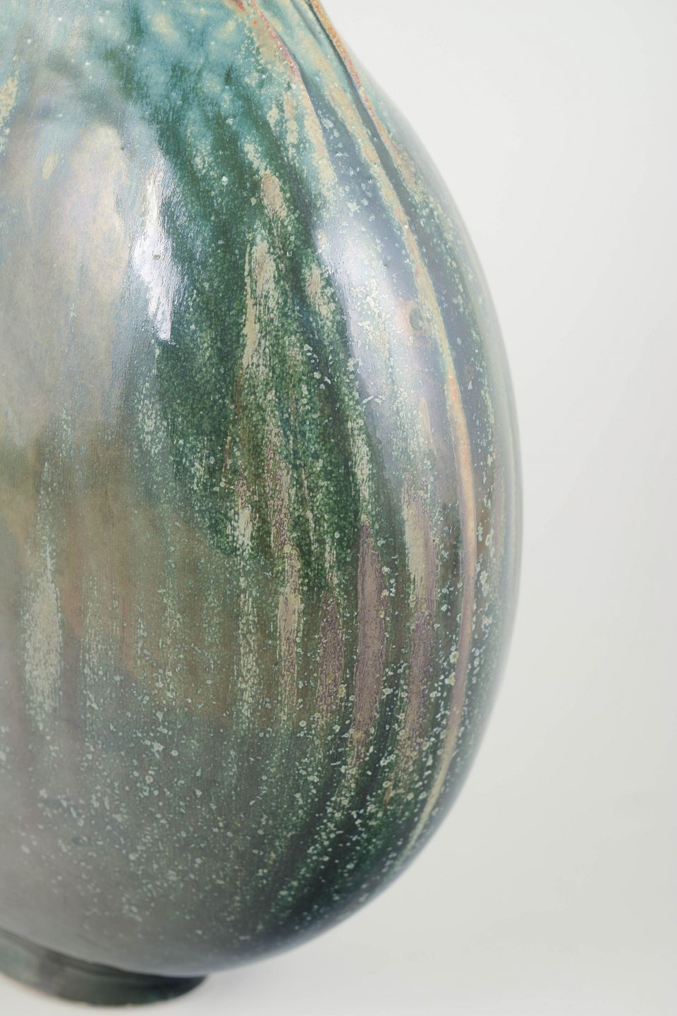 Studiokeramikken i 1980’erne var præget af stærke skulpturelle udtryk og en eksperimenterende tilgang til form. Mange keramikere arbejdede med organiske, næsten naturinspirerede former, hvor glasurens løbere og farvespil blev en integreret del af den kunstneriske helhed. Denne type skulpturel vase repræsenterer et tydeligt skift mod det frie, abstrakte formsprog, der kom til at kendetegne store dele af europæisk studiokeramik i perioden.