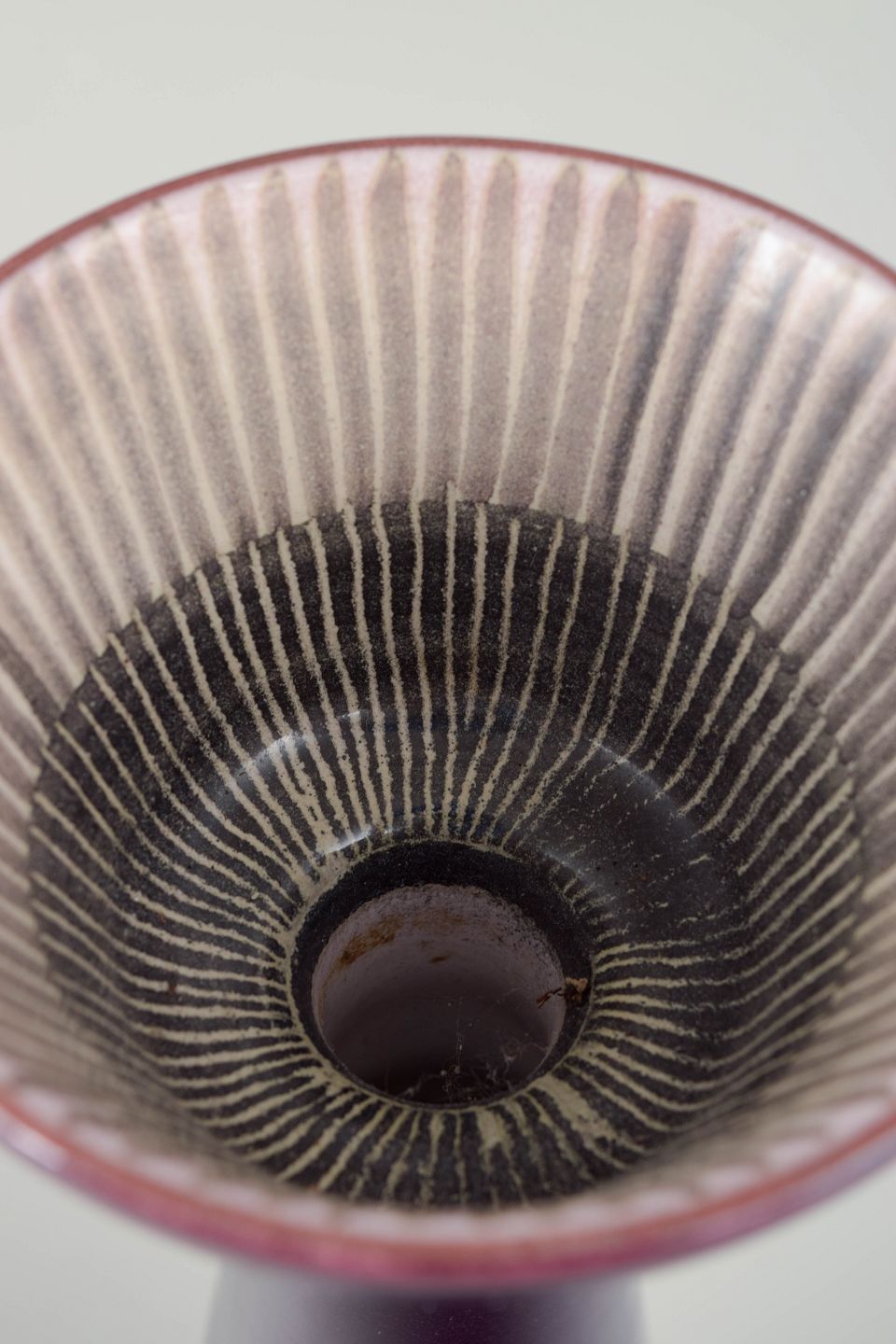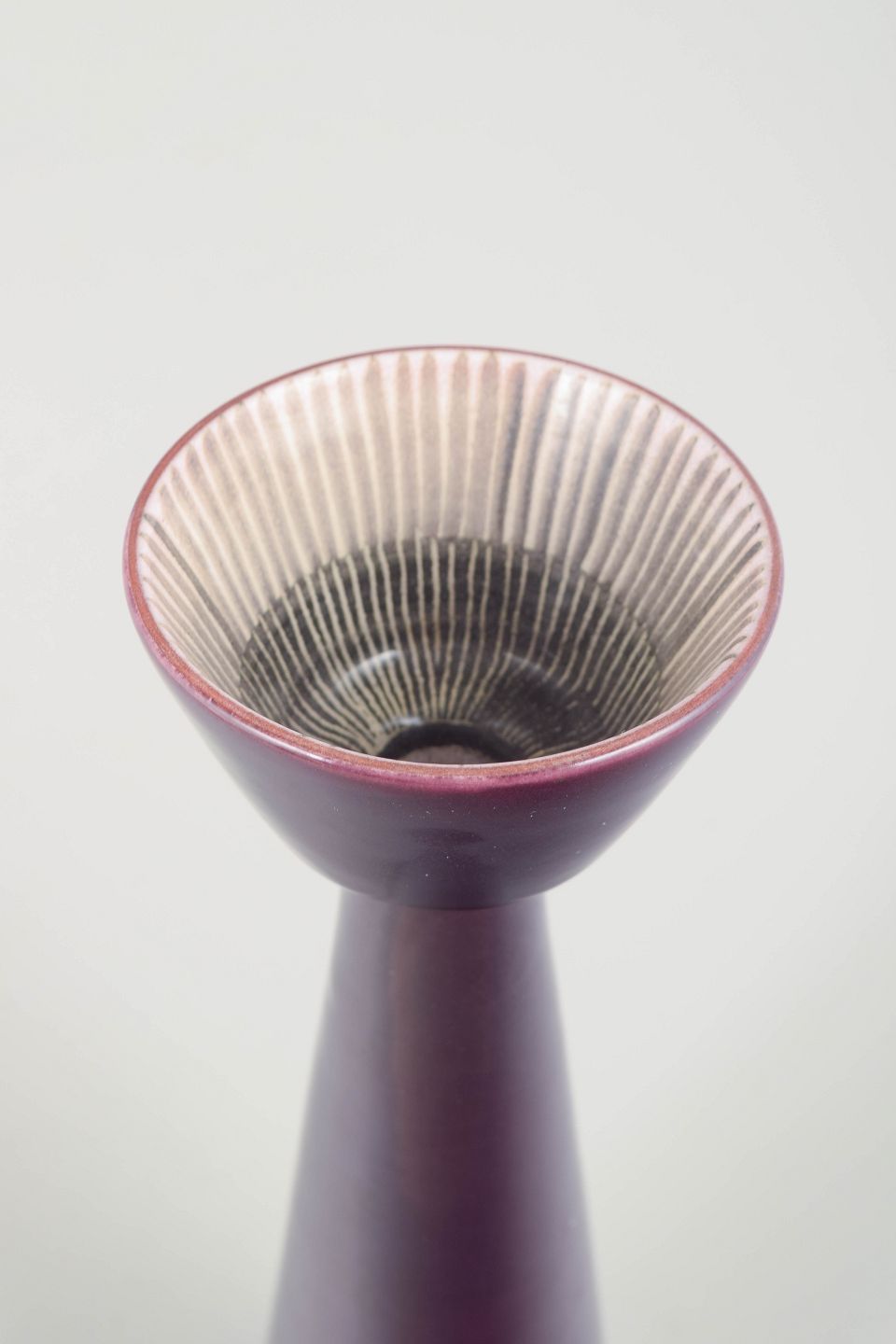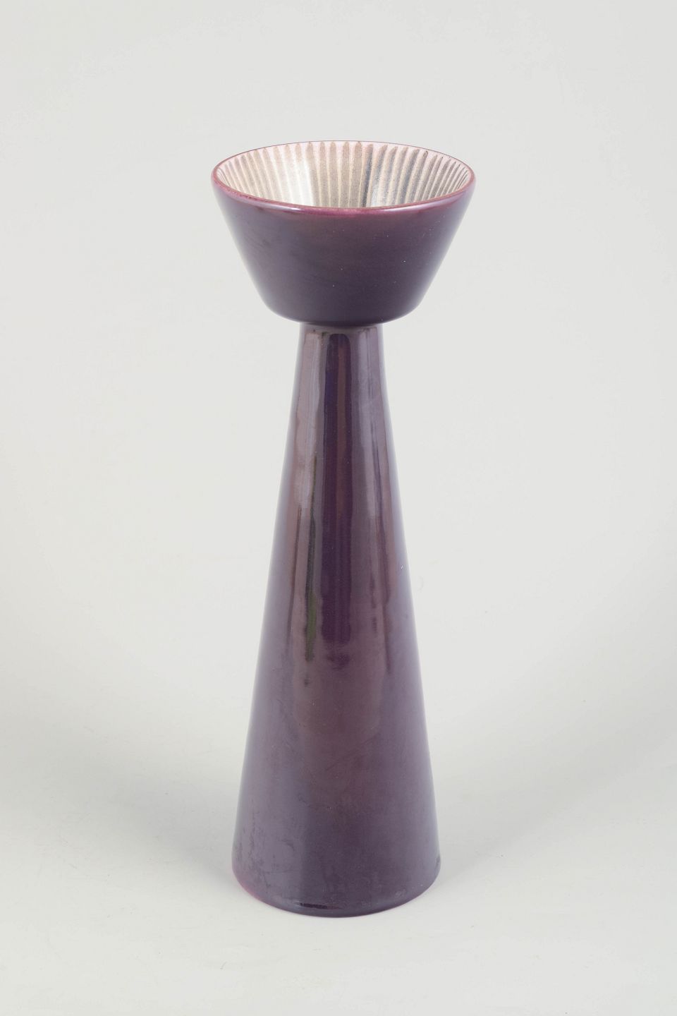Skulpturel konisk vase i dyb lilla glasur med riflet skålformet åbning i kontrasterende lyse toner. Et markant, dekorativt 1960’er-design med Simmulsons karakteristiske formsprog.