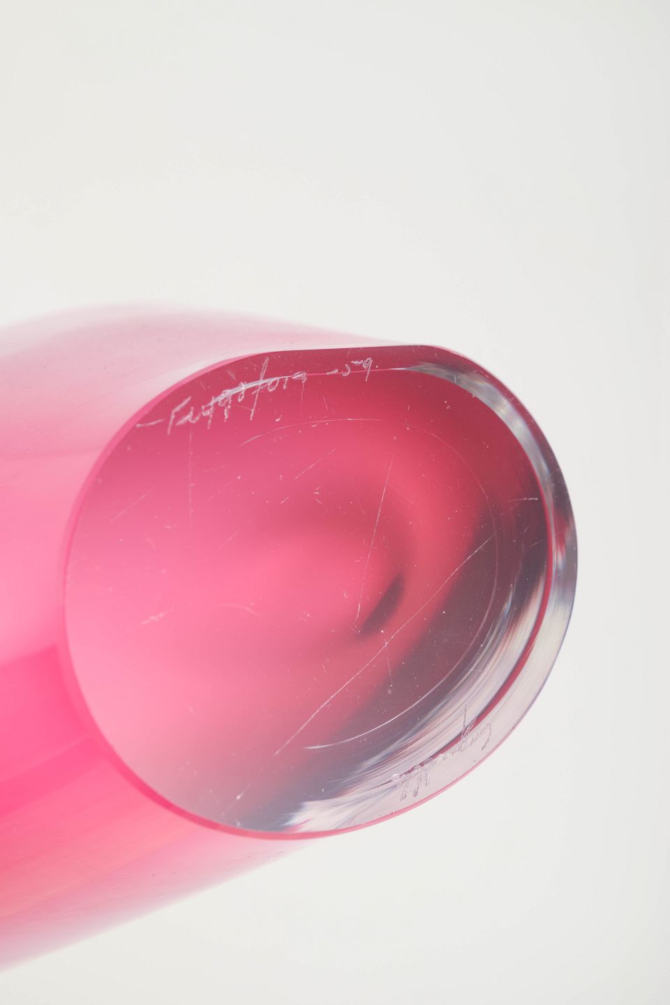 Imponerende “Coquille”-skål i flerlaget kunstglas med dyb rosa indfarvning og klart yderlag. Den brede, svungne V-form er karakteristisk for Kedelvs mest ikoniske arbejder fra slutningen af 1950’erne.