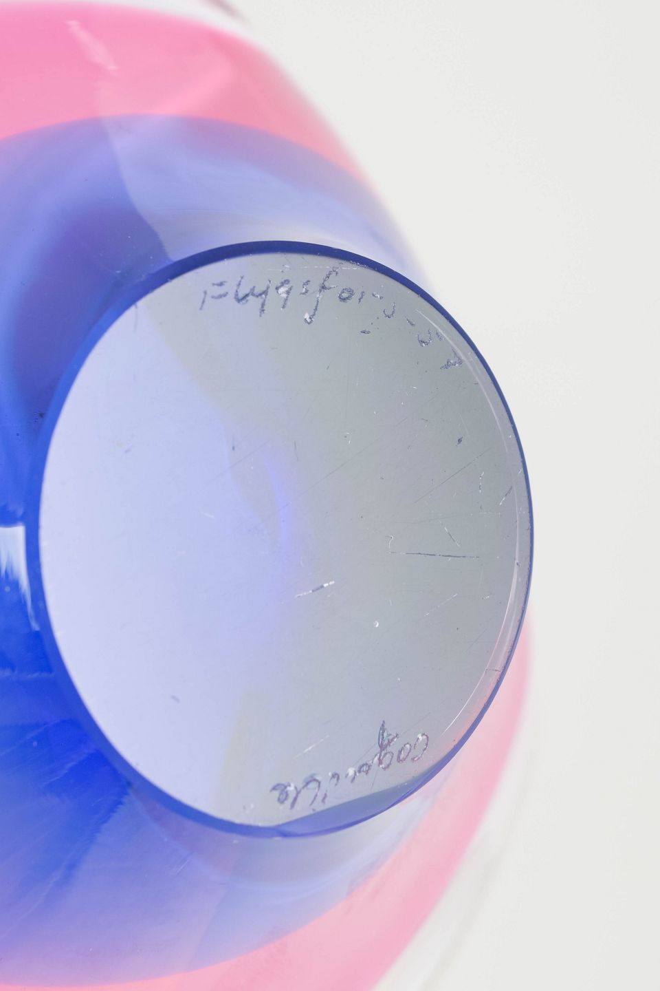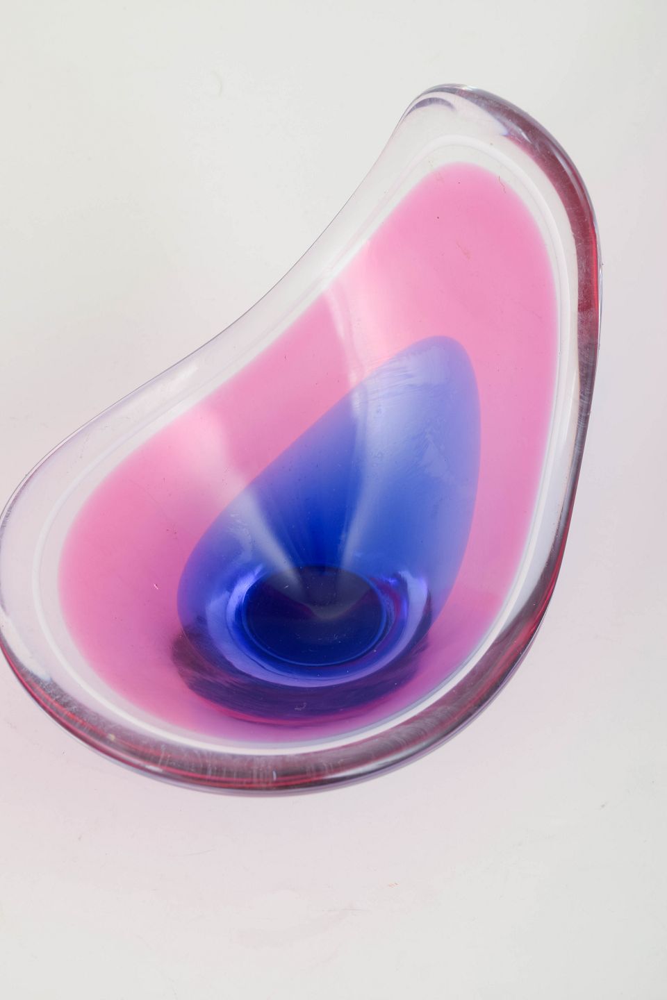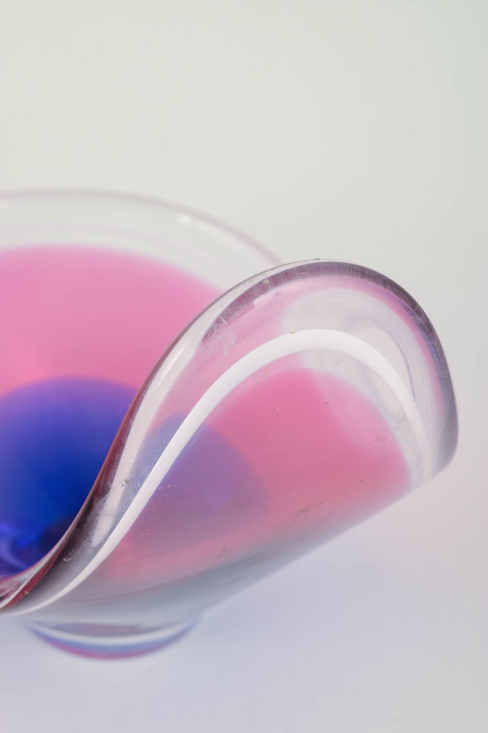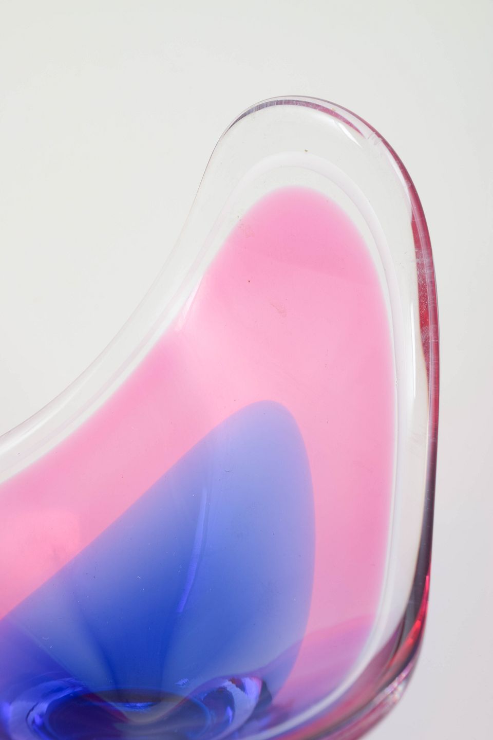 Elegant “Coquille”-skål i flerlaget kunstglas med rosa og blå indre farvenuancer, organisk løftet form og klart yderlag, typisk for Kedelvs skulpturelle glasudtryk.