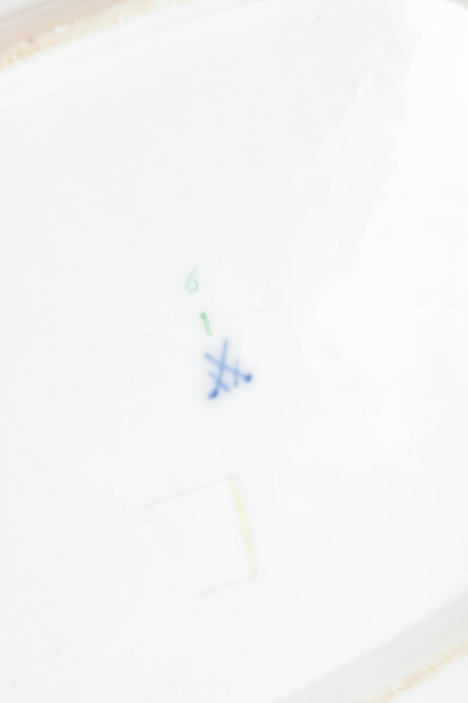 Rektangulært porcelænsfad fra Meissen med rigt dekoreret rokokoinspireret relieframme og omfattende håndmalet kobber-guldbemaling. De florale motiver og de svungne ornamenter giver fadet et karakteristisk og overdådigt udtryk fra slutningen af 1800-tallet.