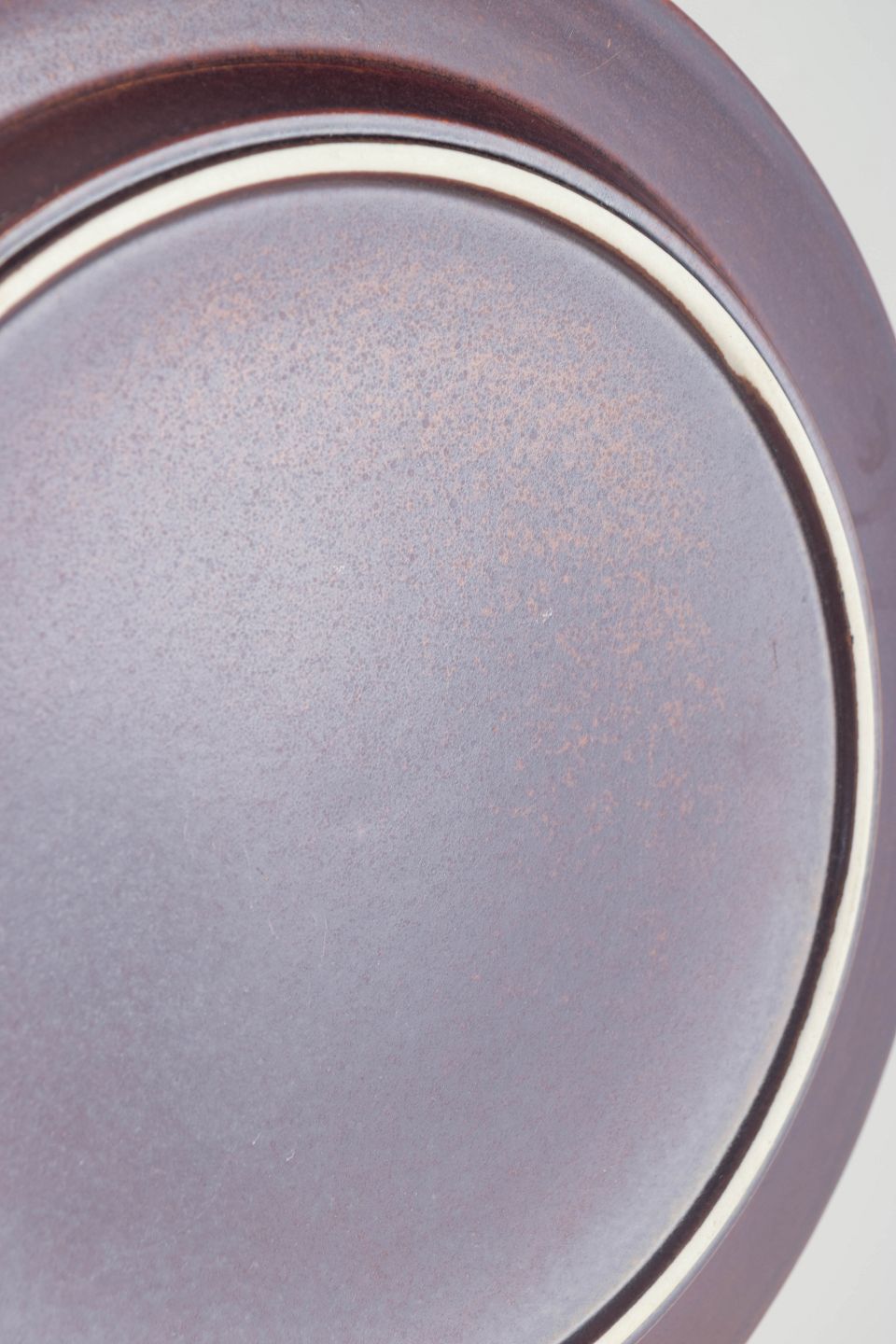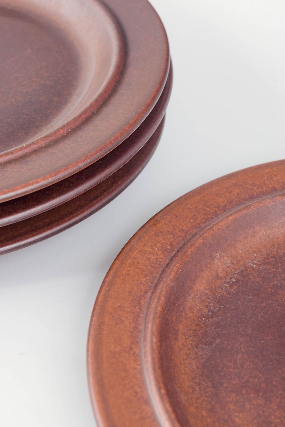 Fire middagstallerkener i mørkebrunt stentøj fra Arabia’s ikoniske “Ruska”-serie, kendetegnet ved den robuste chamotte-krop og den dybe, matbrune jernglasur med naturlige nuancer.