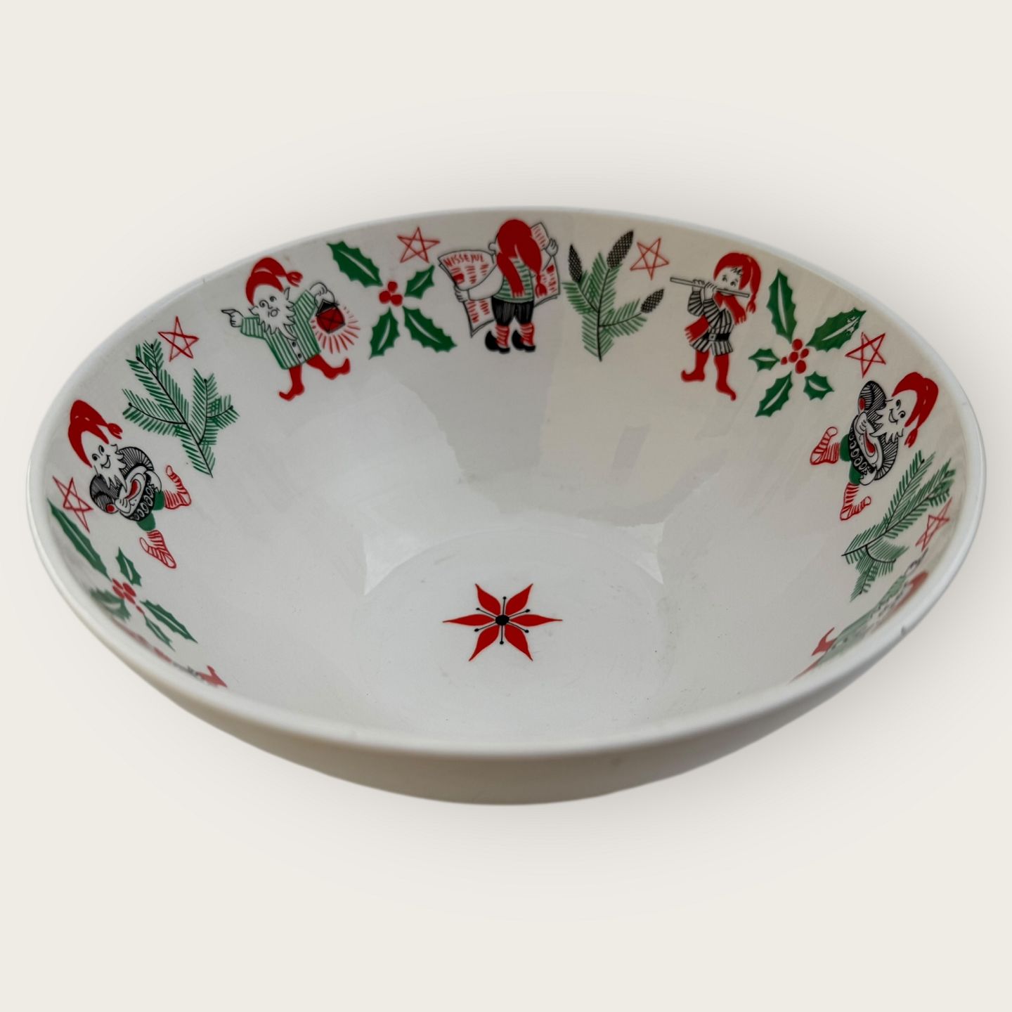 Servierschale aus Stavanger-Feuerstein, Norwegen, mit Gnomenmotiven, 21 cm Durchmesser und 9,5 cm hoch. *Leichte Risse unter der Glasur, ansonsten in gutem Zustand.*