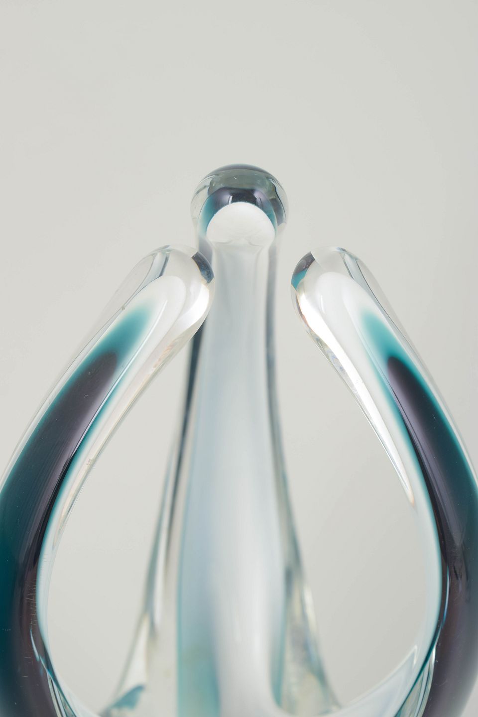 Organisk, skulpturel kunstglas vase/skulptur i klart glas med lag i turkis og dyb blå-violette toner. Mundblæst med de karakteristiske opadstræbende, svungne "flammer" fra Coquille-serien. Originalt Flygfors mærke. Signeret.