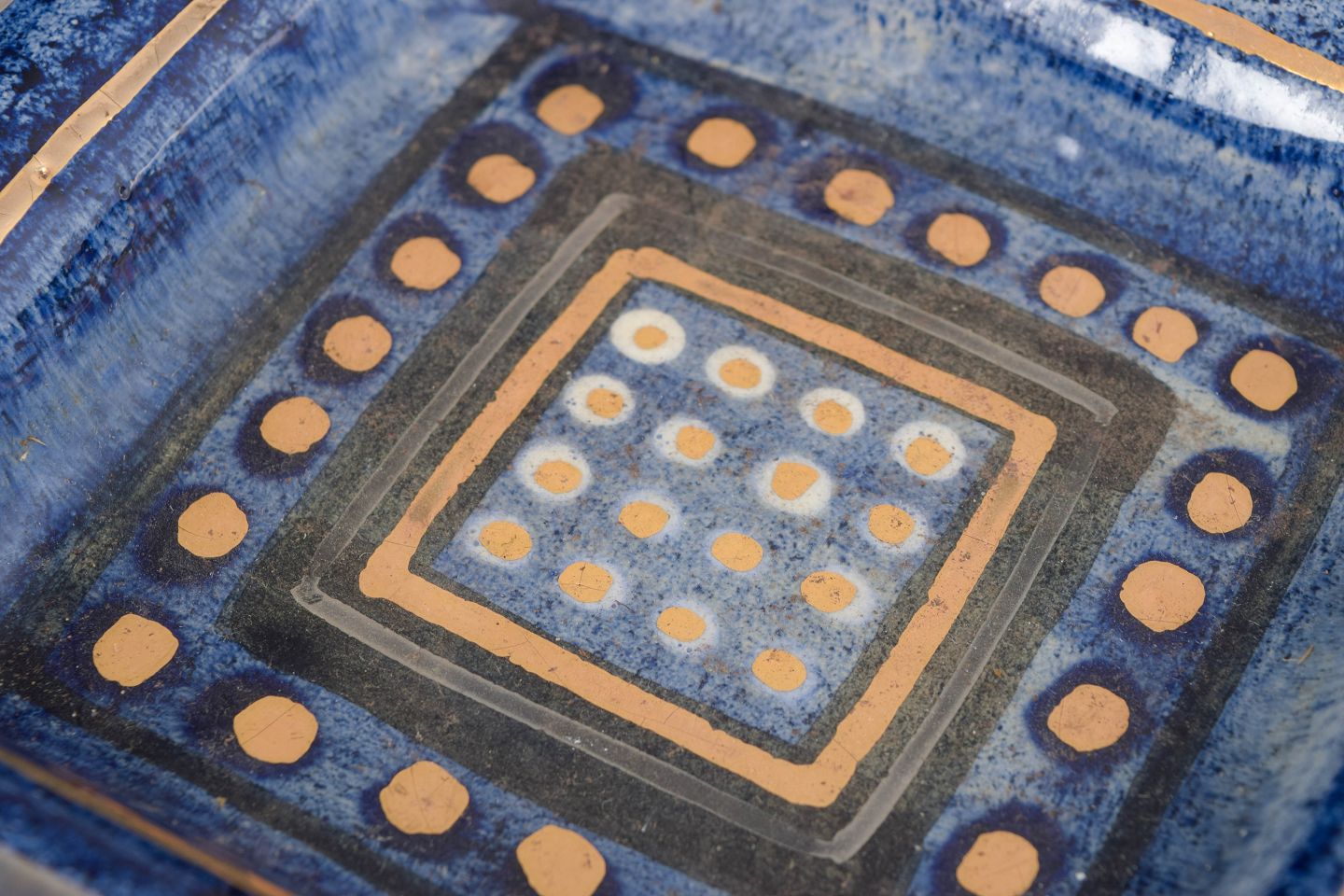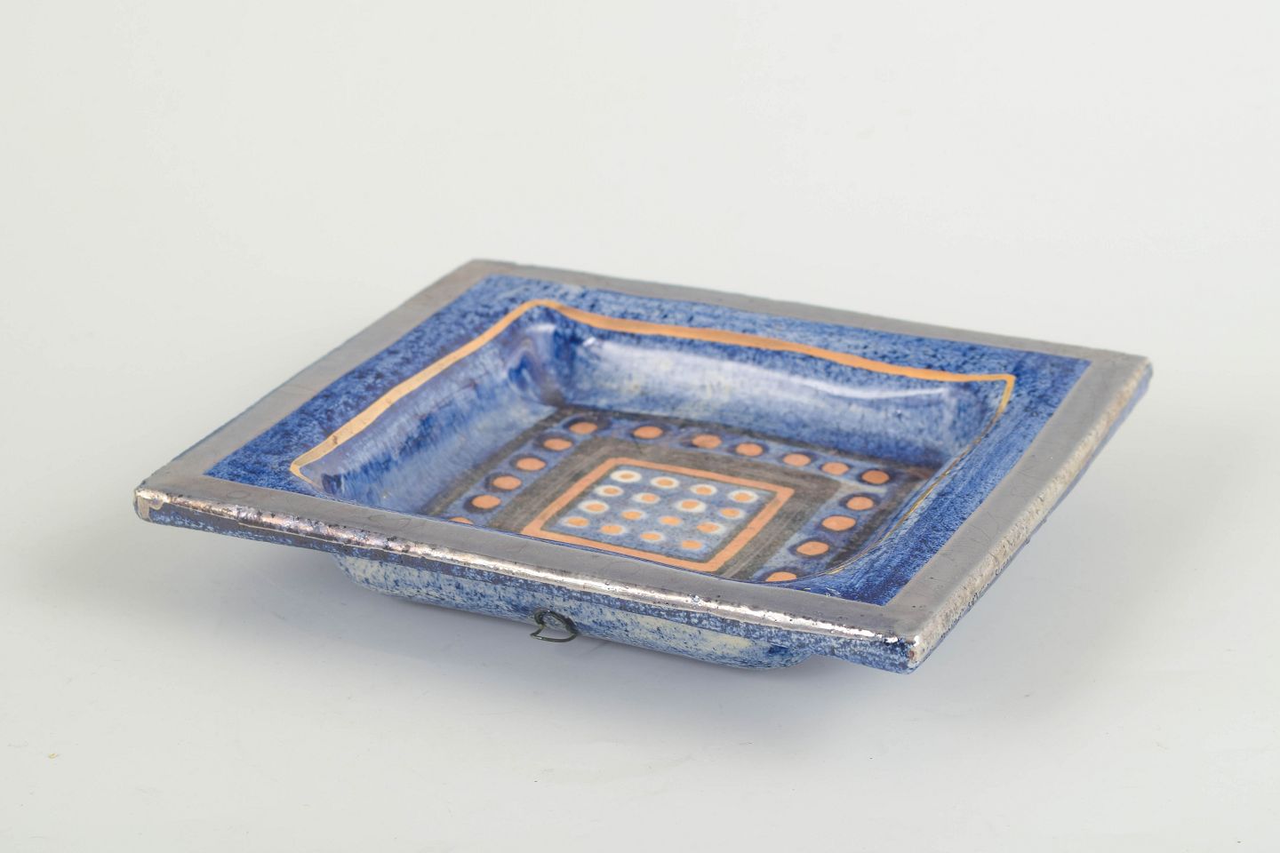 Rektangulært, lavt fad i håndlavet keramik med Pelletiers karakteristiske geometriske dekoration i blå, okker og hvid.