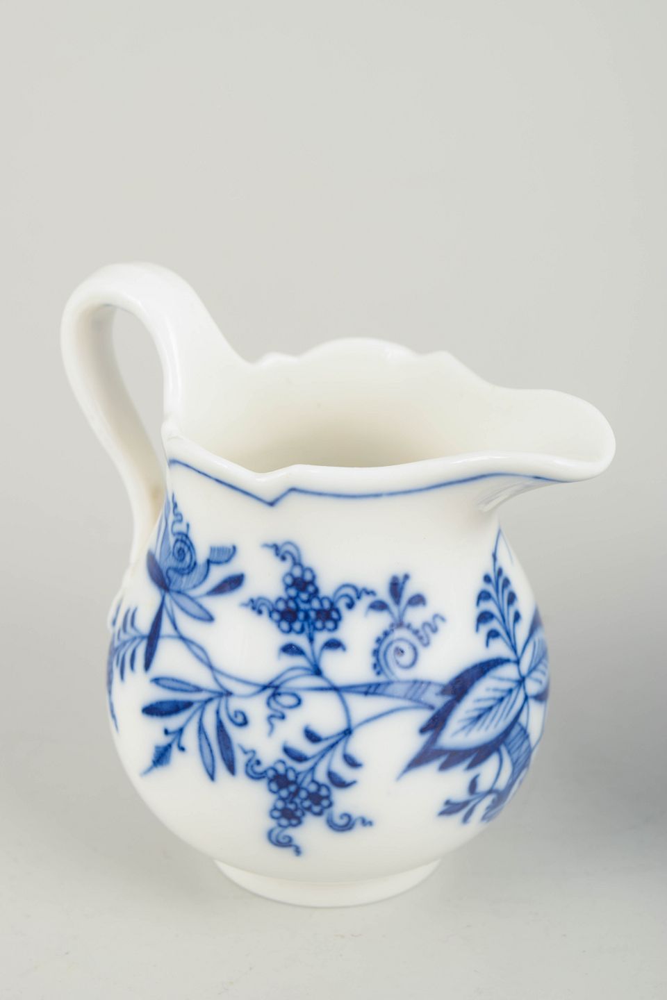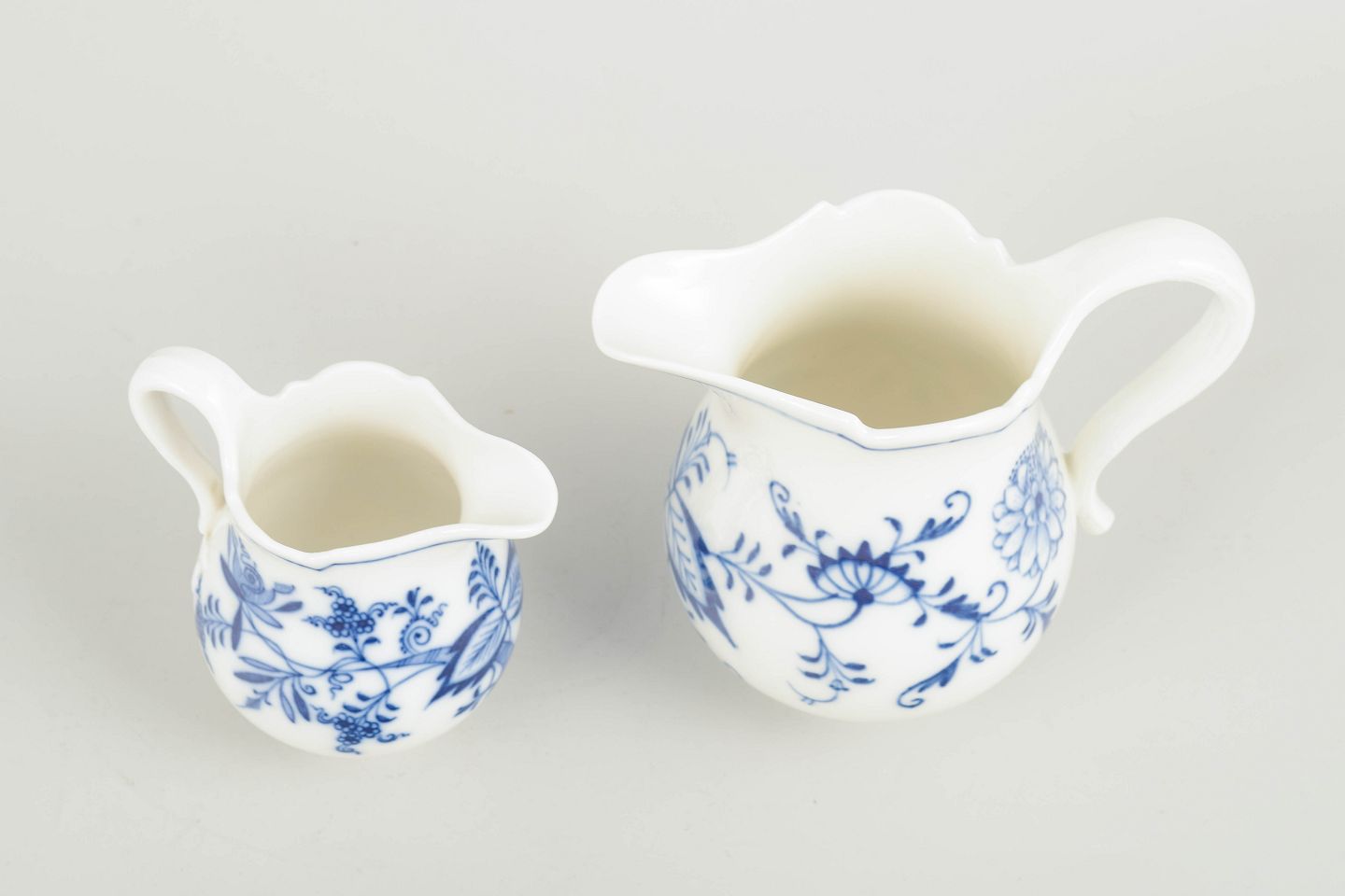 To flødekander i Meissens klassiske “Zwiebelmuster”-dekoration, håndmalet i koboltblå på hvidt porcelæn. Organiske svungne korpusformer med buet hank og bølget kant.