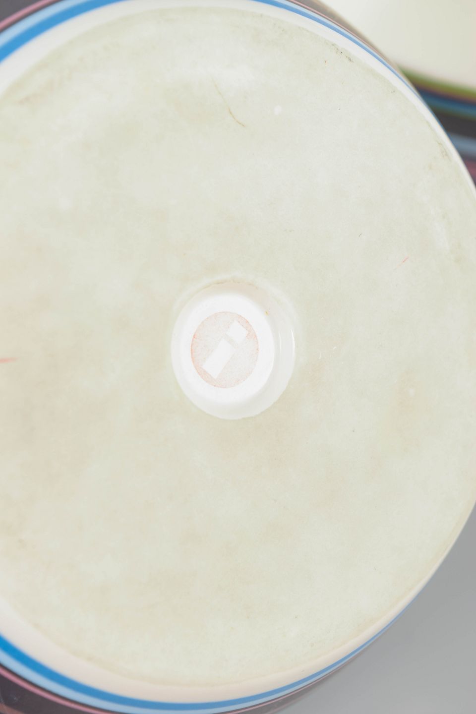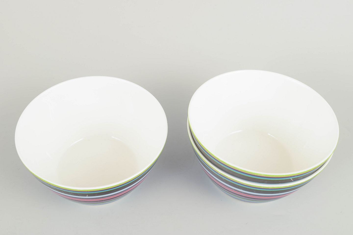 Tre farvestrålende skåle i porcelæn fra den ikoniske Origo-serie, dekoreret med de karakteristiske flerfarvede, horisontale striber.
