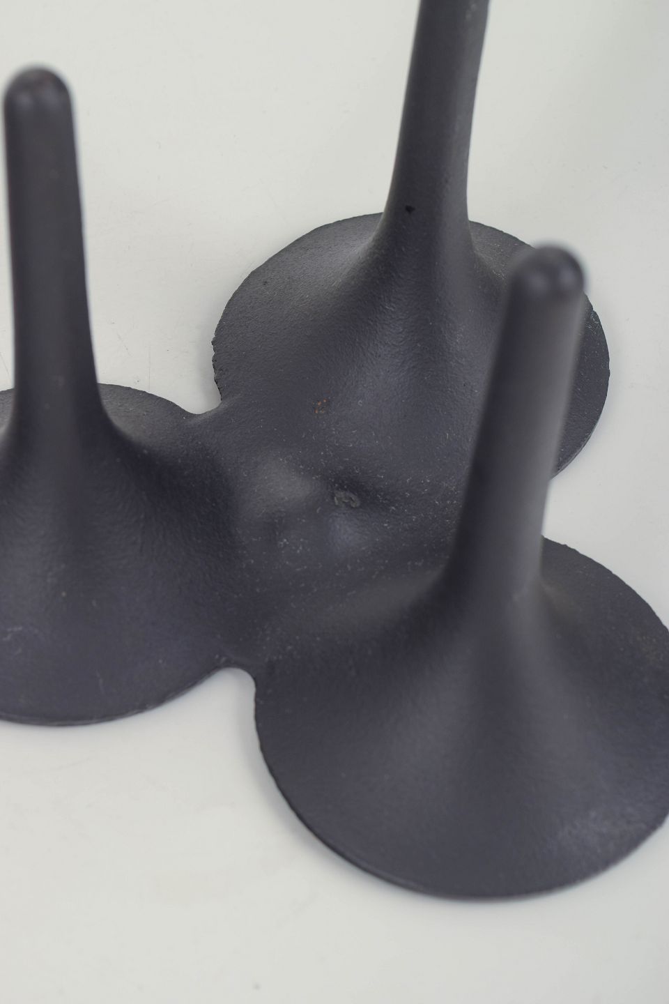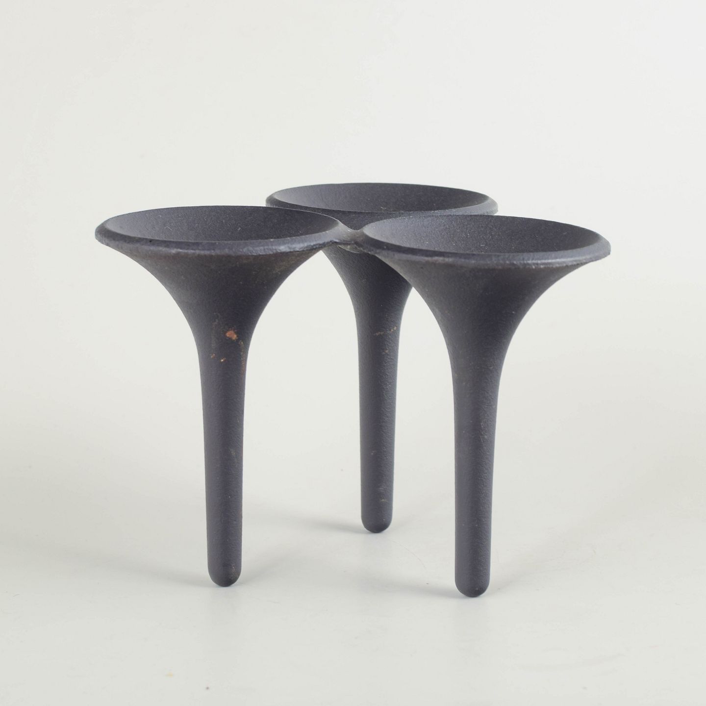 Skulpturel, organisk formet lysestage i sortlakeret støbejern, udført i Quistgaards karakteristiske modernistiske formsprog. De tre koniske ben mødes i en samlet top med tre skåleformede holdere.