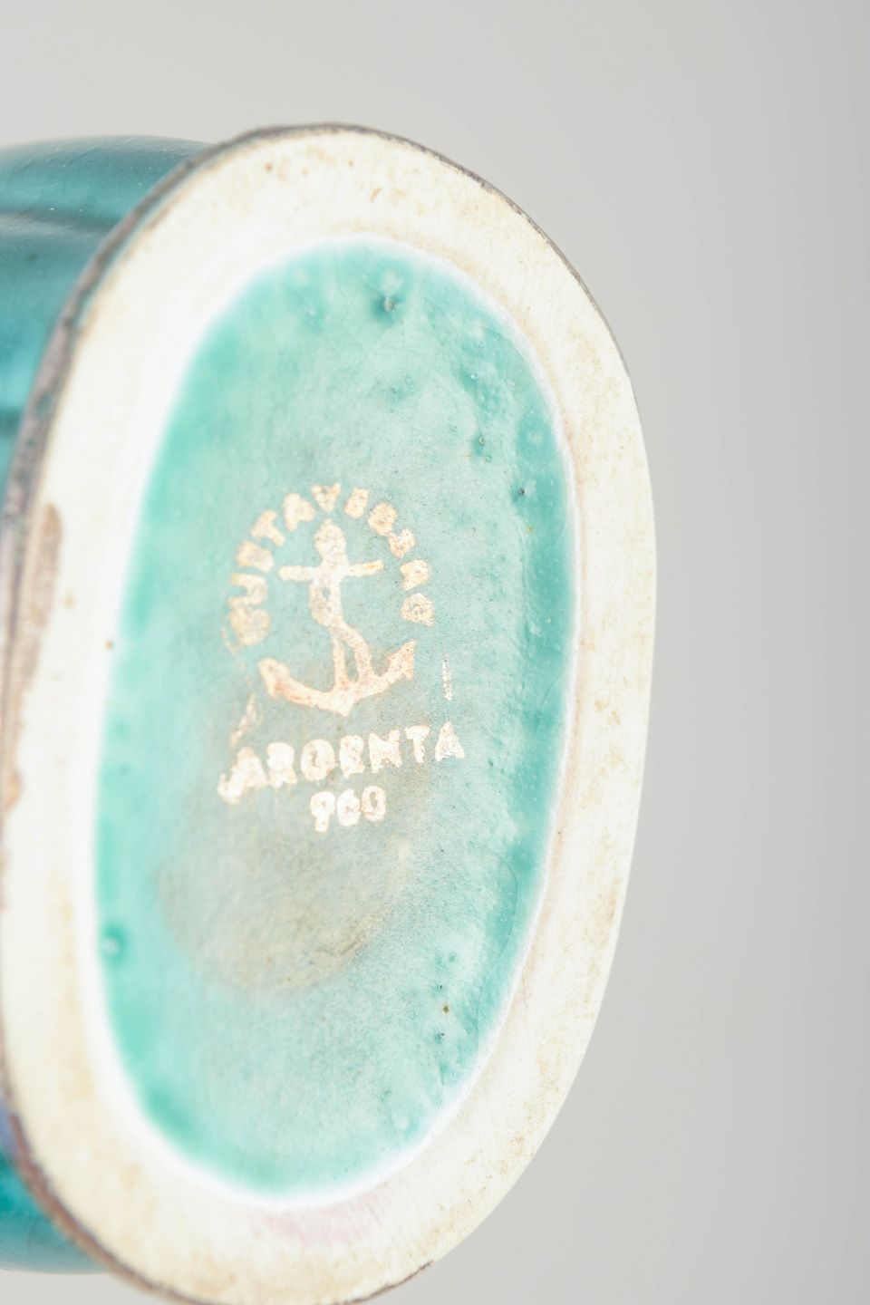 Skål og lille vase i klassisk turkis glasur med indlagte sølvdekorationer, karakteristisk for Kåges ikoniske Argenta-arbejder for Gustavsberg. Elegante, små formater med tydelig studiopræcision.