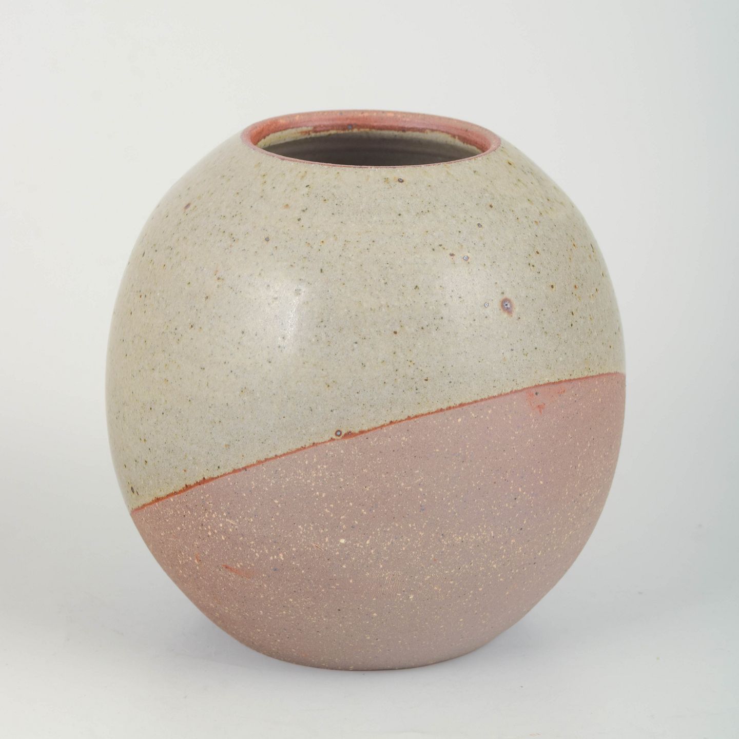 Hånddrejet stentøjsvase i afrundet, organisk form. Udført i Palms karakteristiske rå, taktile udtryk med en todelt, mat glasur: øverste del i lys, kalket tone og nederste del i støvet rosa. Et elegant og harmonisk eksempel på Palms mere minimalistiske arbejder fra perioden.