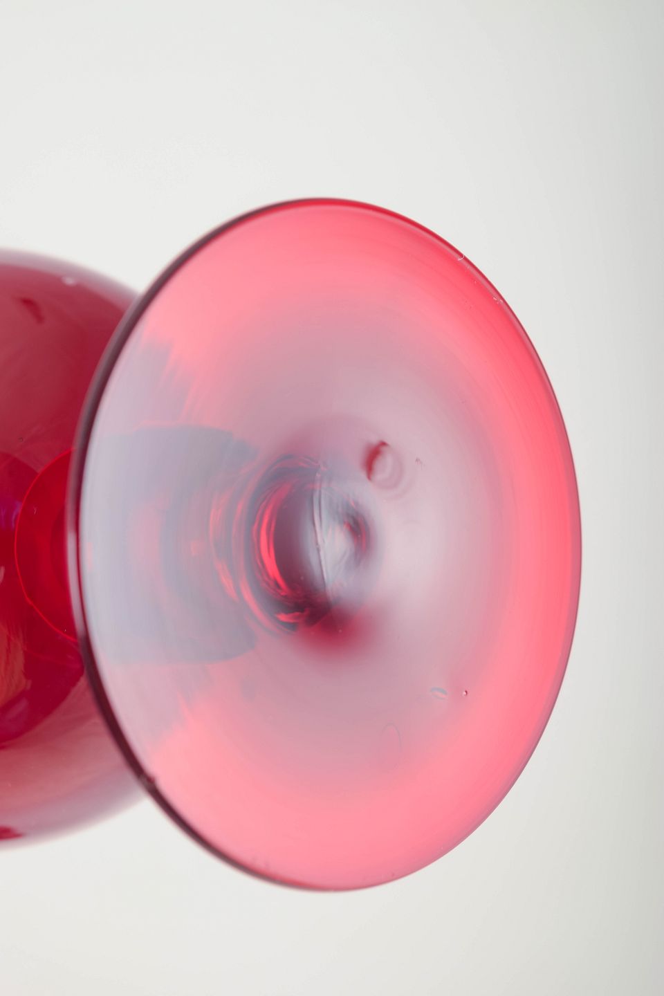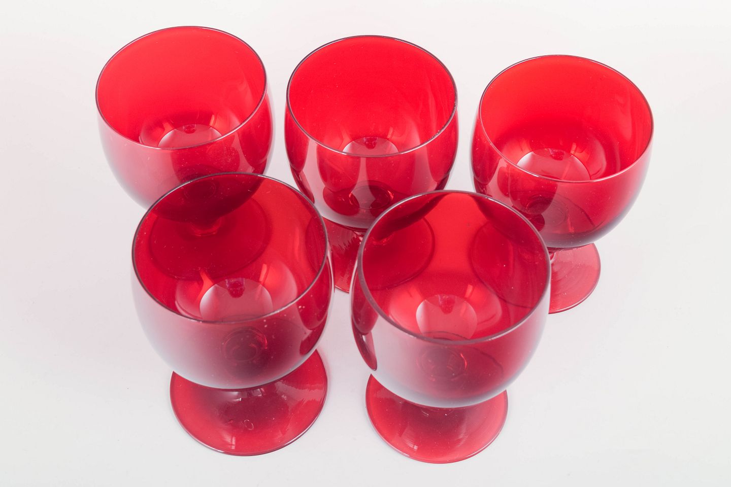 Sæt af fem rubinrøde rødvinsglas i klassisk form med rund kupa og profildrejet stilk. Den dybe røde tone er karakteristisk for Reijmyres midt-århundrede produktion.