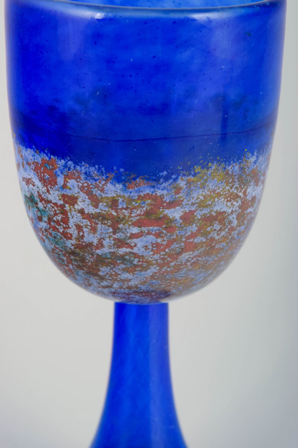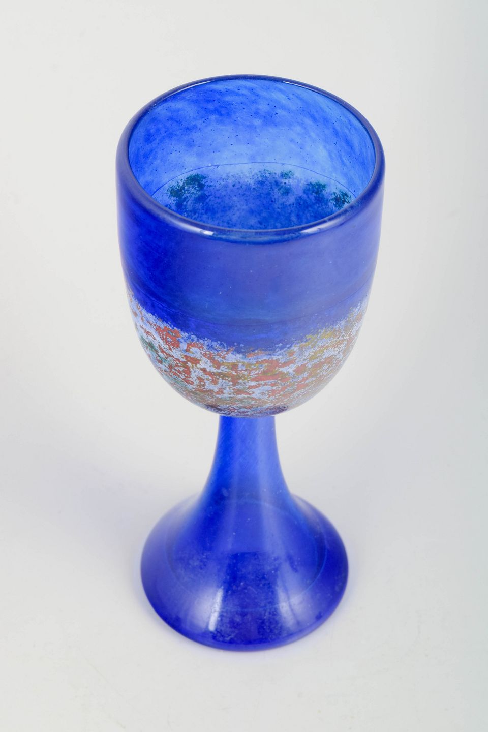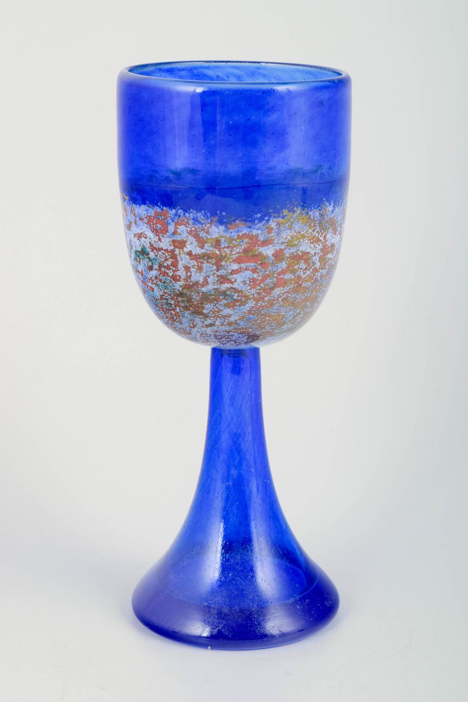 Signeret kunstglasbæger i intens koboltblå med dekoreret bælte af multikolorerede indsmeltede partikler. Skulpturelt formet fod og klassisk bægerform, typisk for Engmanns farvestærke og fortællende udtryk.