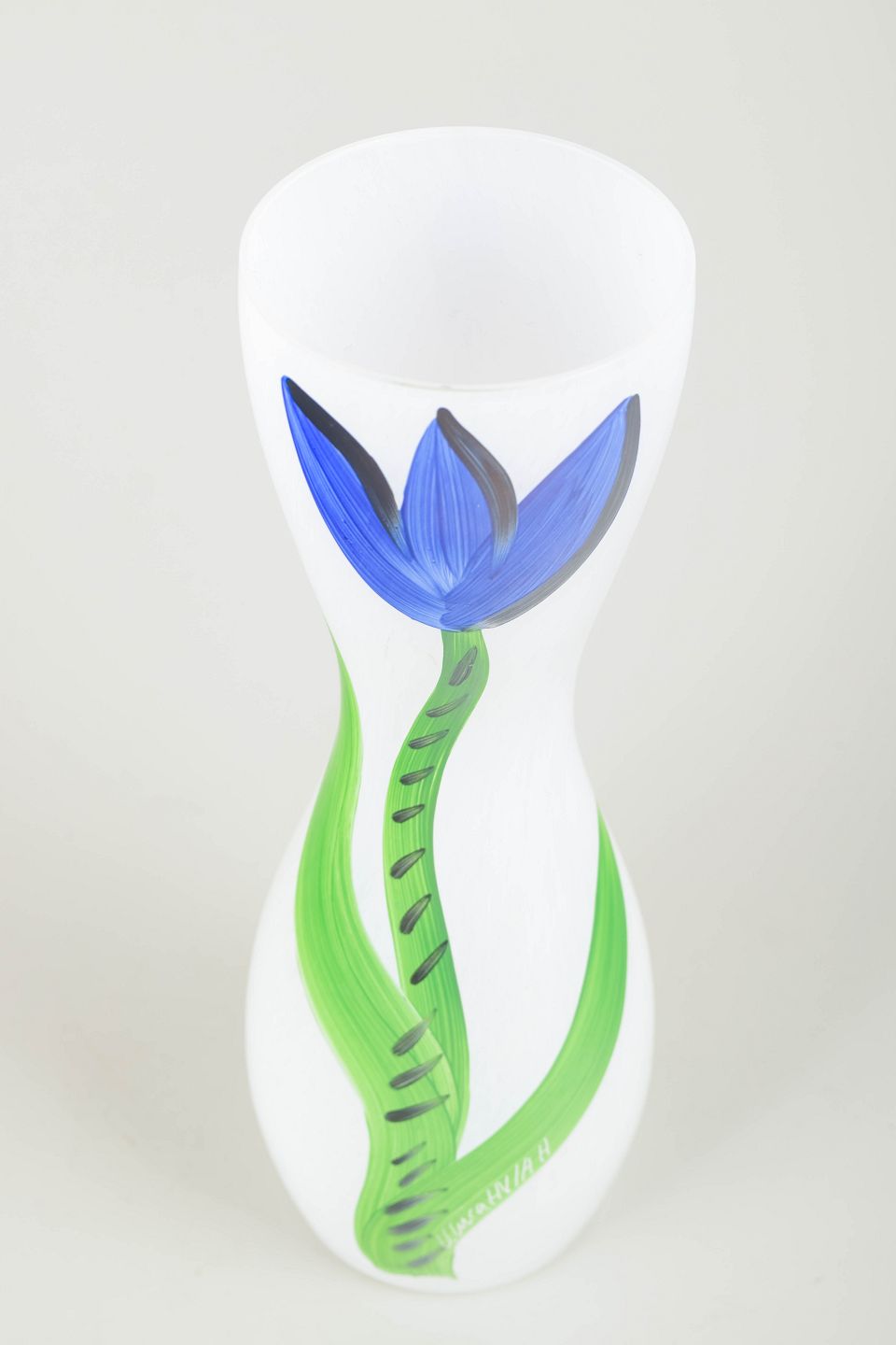 Håndmalet, organisk formet glasvase i opalhvidt art glass med karakteristisk botanisk dekoration i blå og grønne nuancer.
