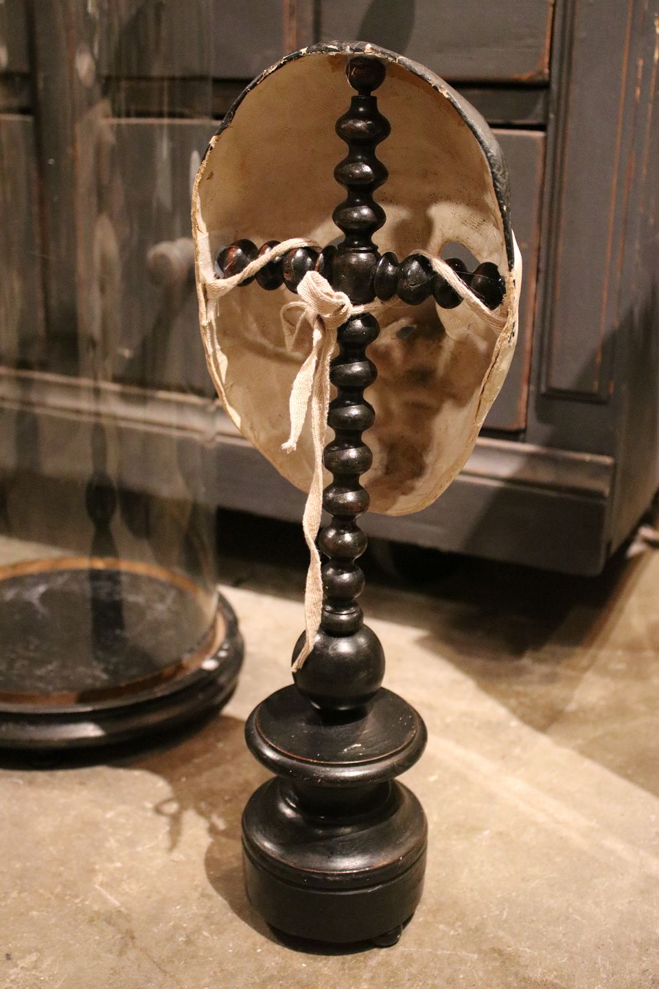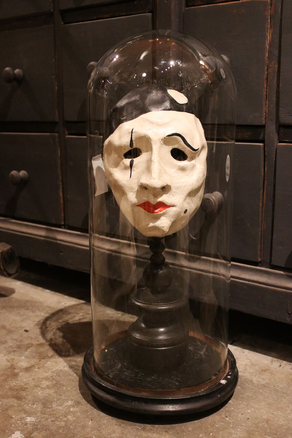 Dekorativ , gammel klovnemaske i bemalet papmache monteret på gammel sortmalet træ fod...