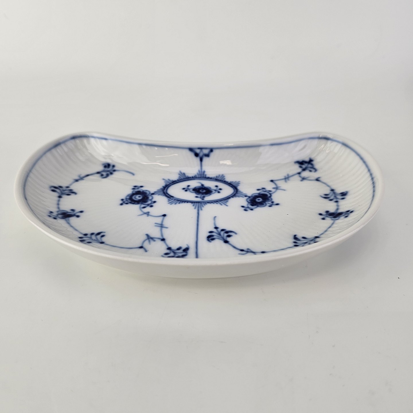 Halvmåneformet fad i kongeligt porcelæn fra stellet Musselmalet Halvblonde