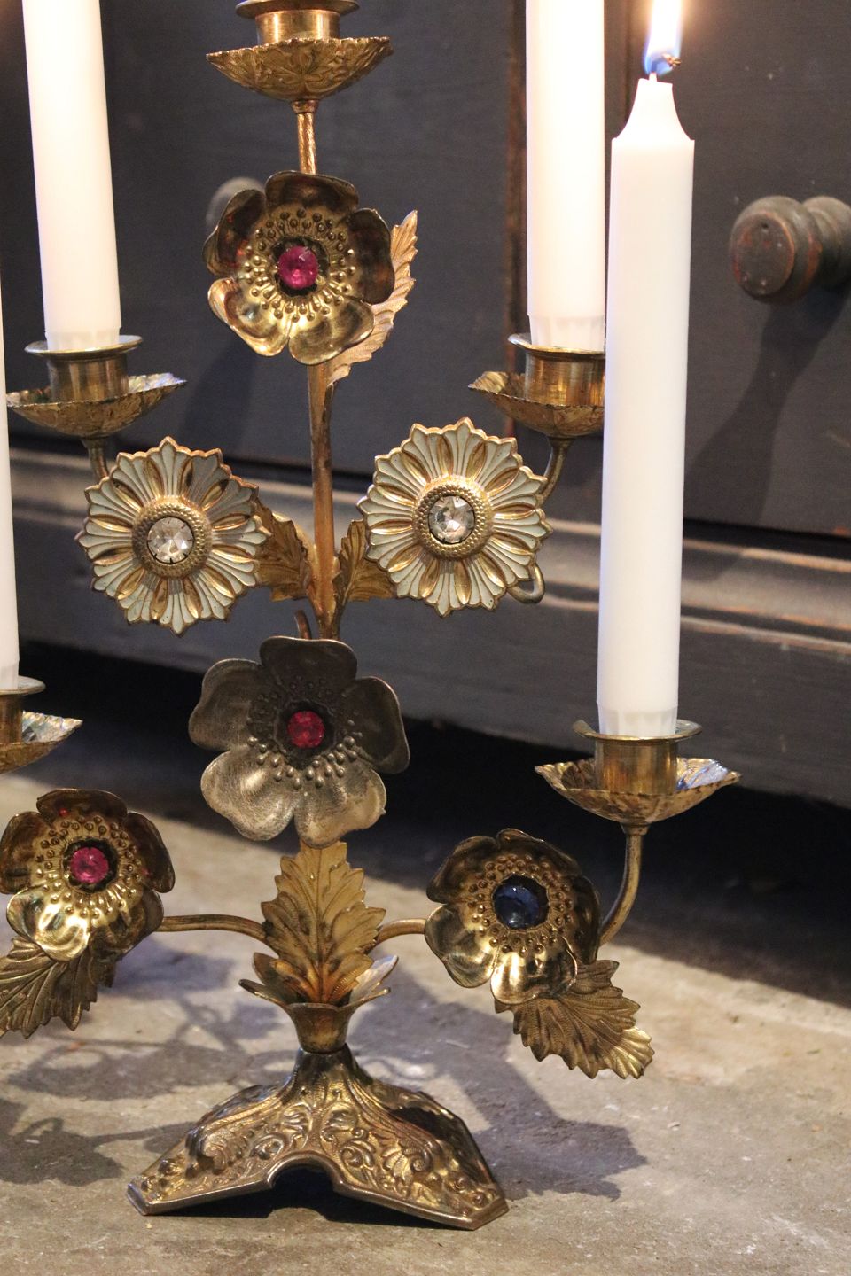 Antik , franske kirkelysestage i forgyldt metal dekoreret med 6 metalblomster med farvet sten...