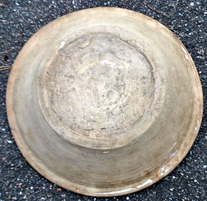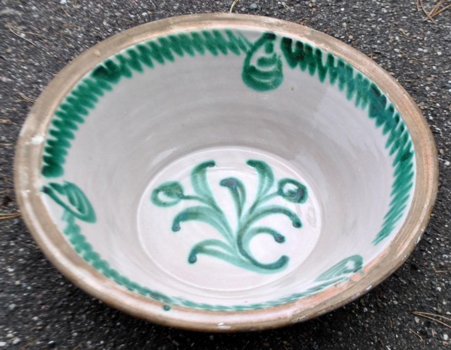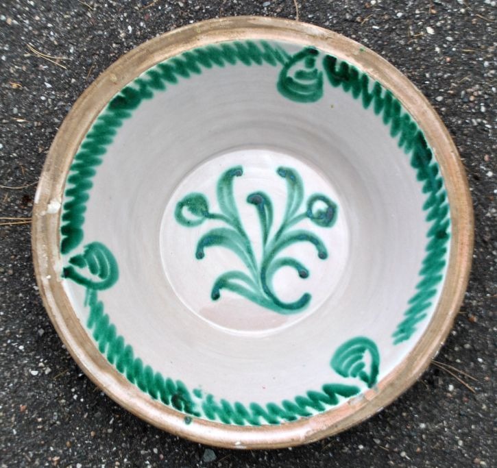 Große antike Tonschale, 19. Jahrhundert. Innen grün und hell glasiert. Mit Rand- und Mitteldekor in Form einer Blume. Durchmesser: 42 cm. Höhe: 12 cm.