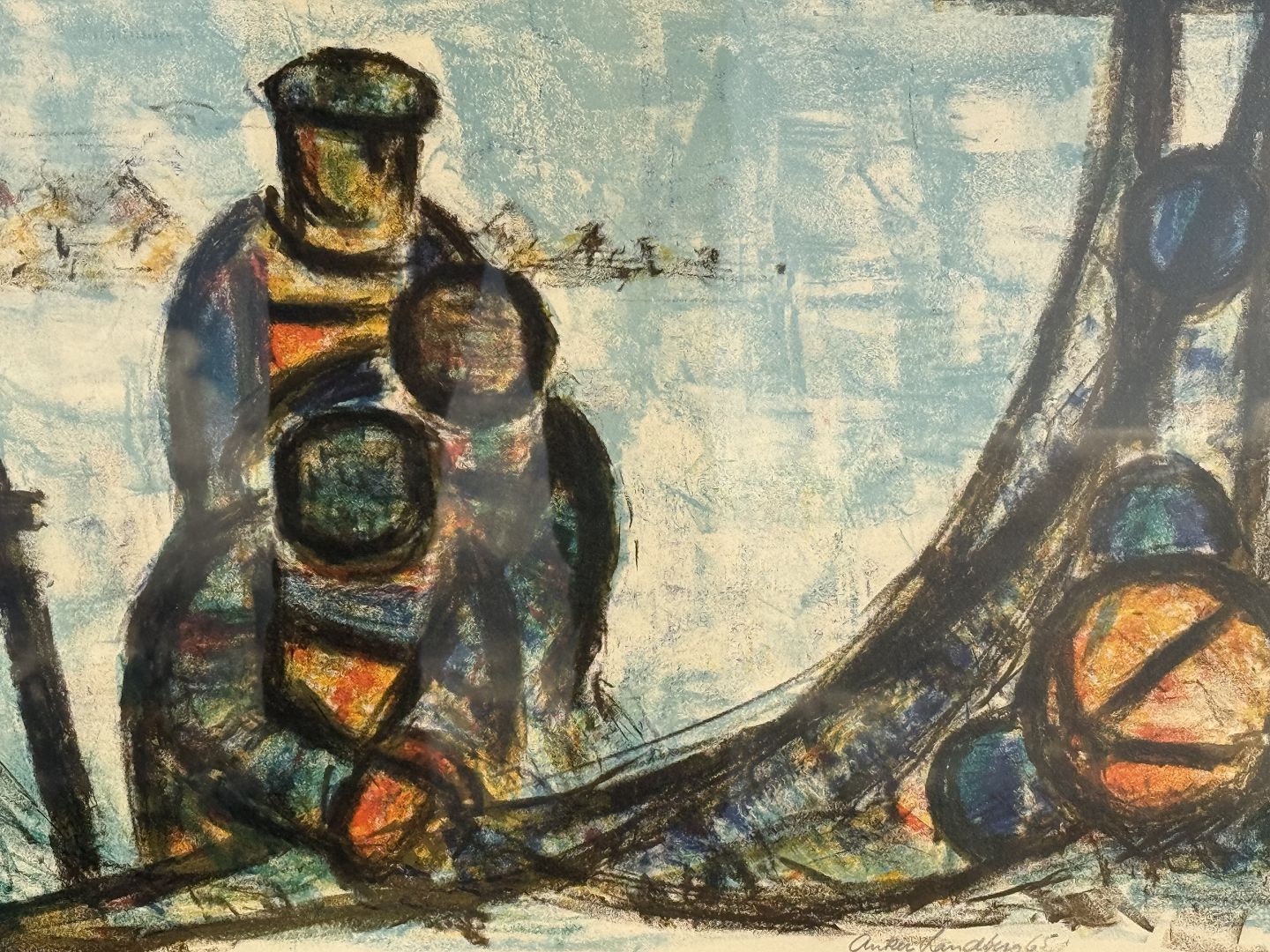 Anker Landberg, Lithografie im Rahmen, Fischer reparieren Netze, signiert Anker Landberg 65, Maße: 67 x 46 cm, Maße mit Rahmen: 82 x 63 cm *sehr guter Zustand*