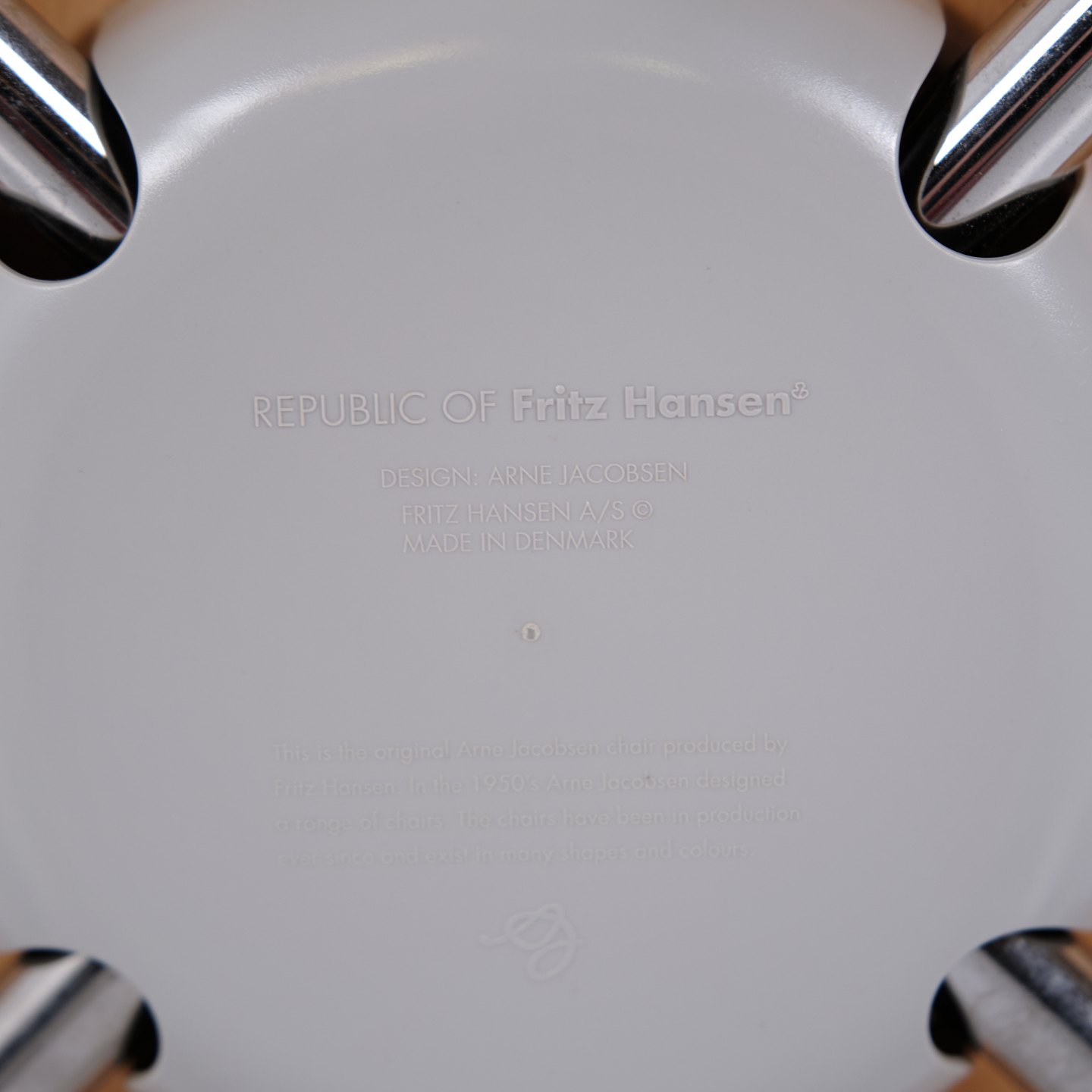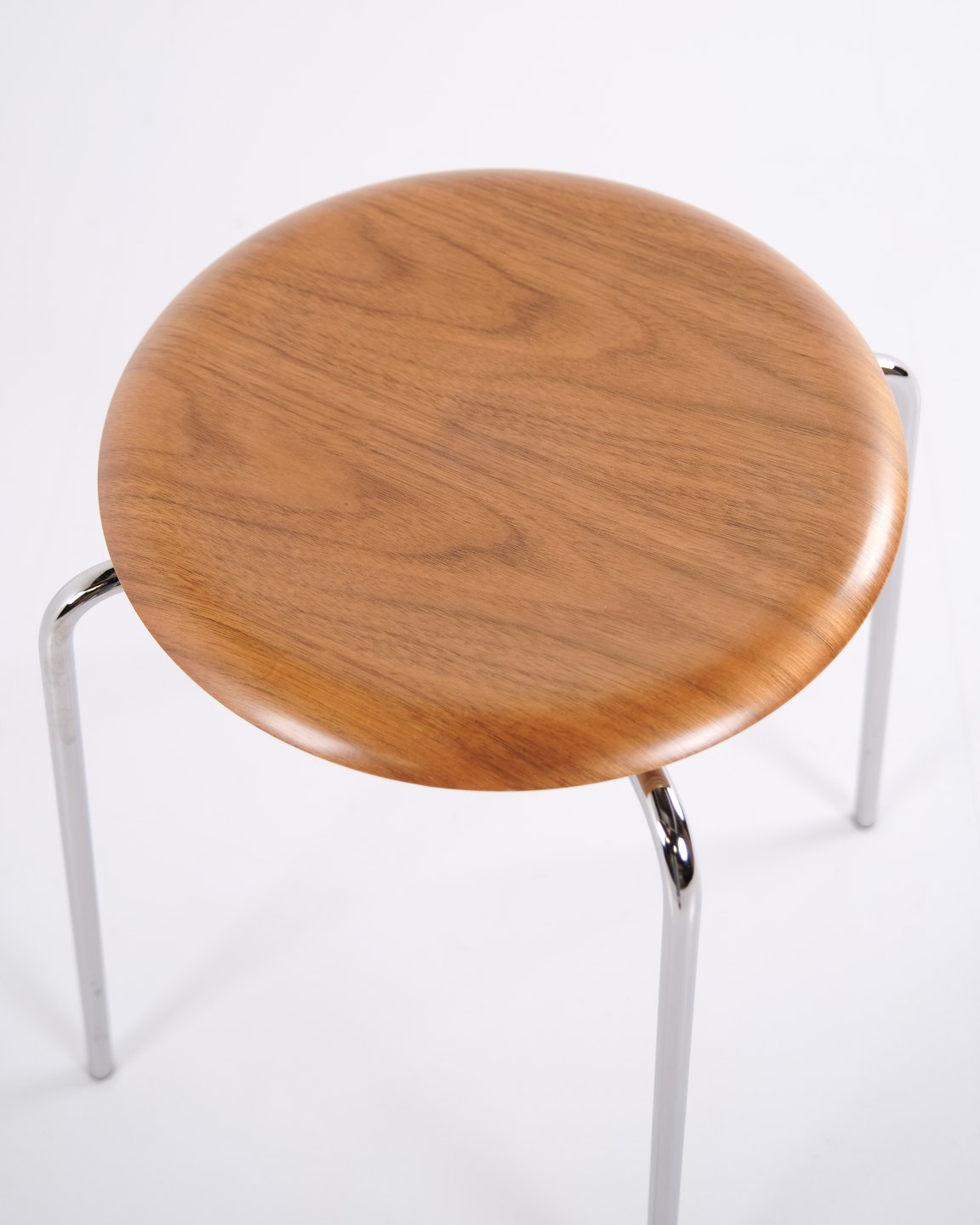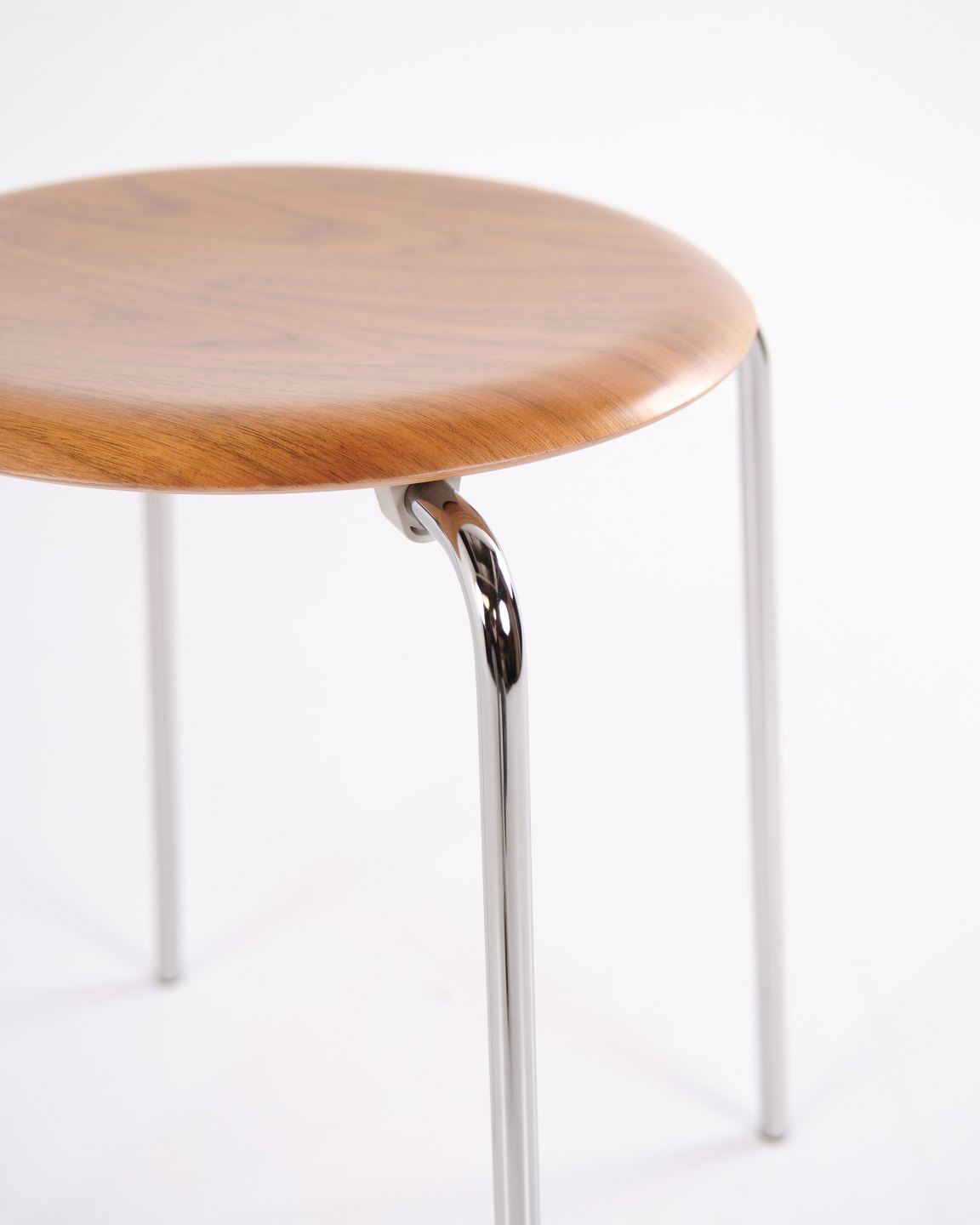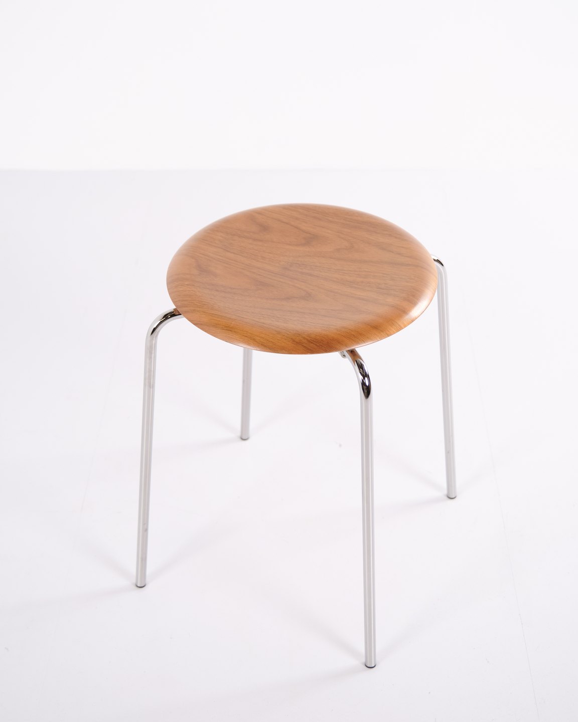 Dot Hocker, entworfen von Arne Jacobsen, gefertigt aus Nussbaumfurnier mit einem verchromten Stahlgestell. Ein klassischer, leichter Hocker, geeignet als zusätzliche Sitzgelegenheit oder dekoratives Designobjekt.
