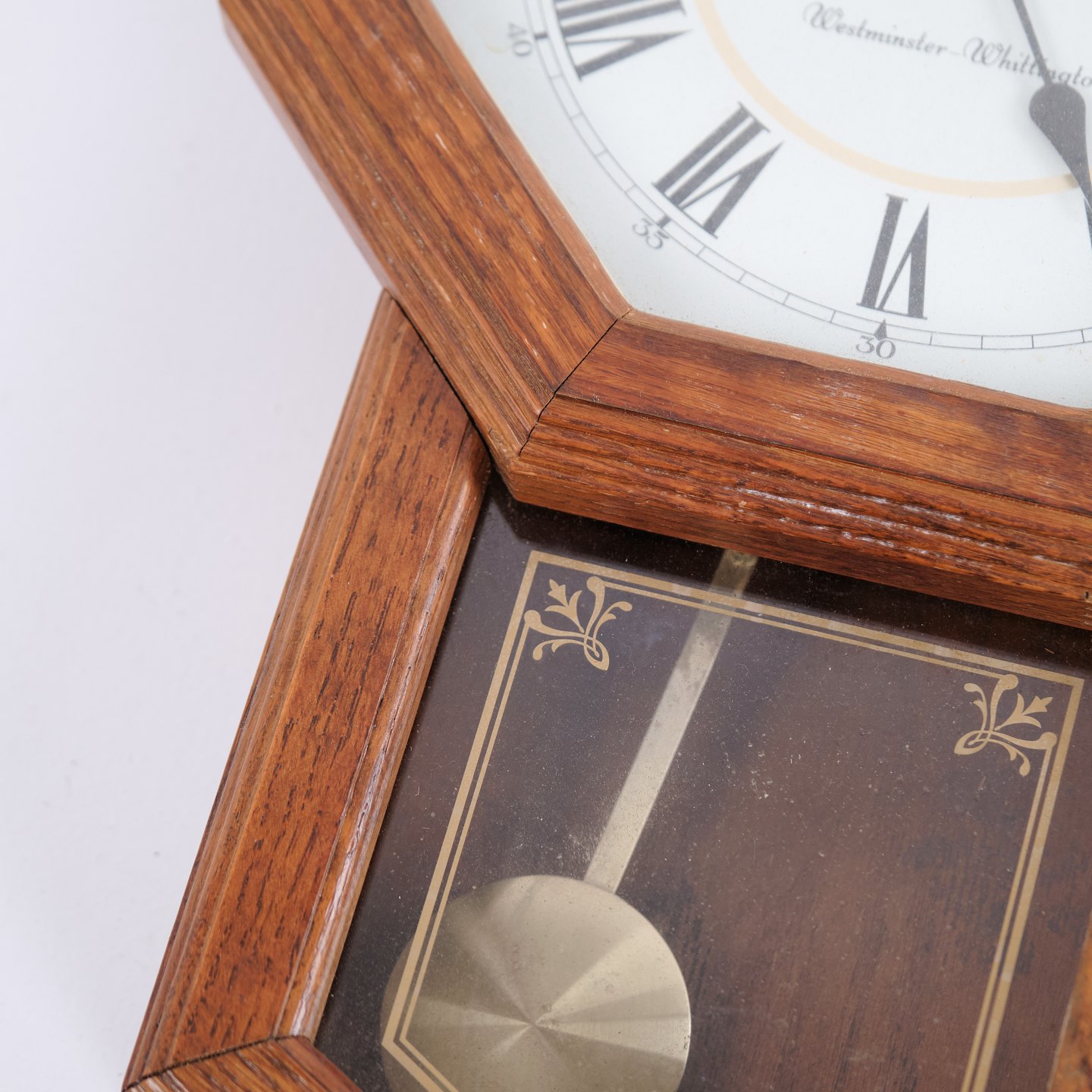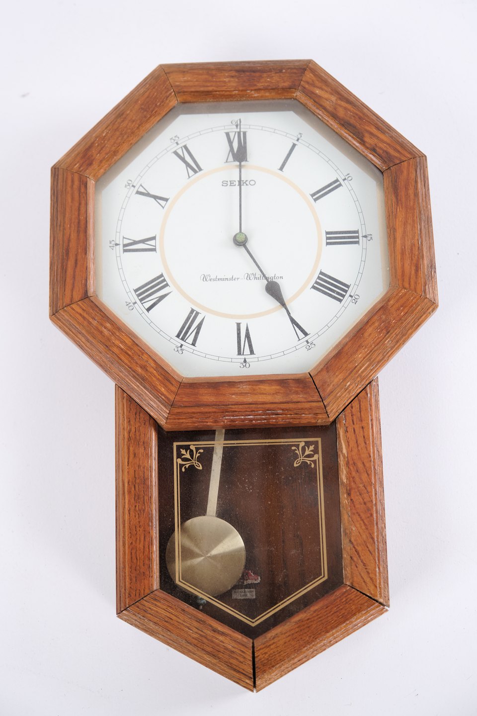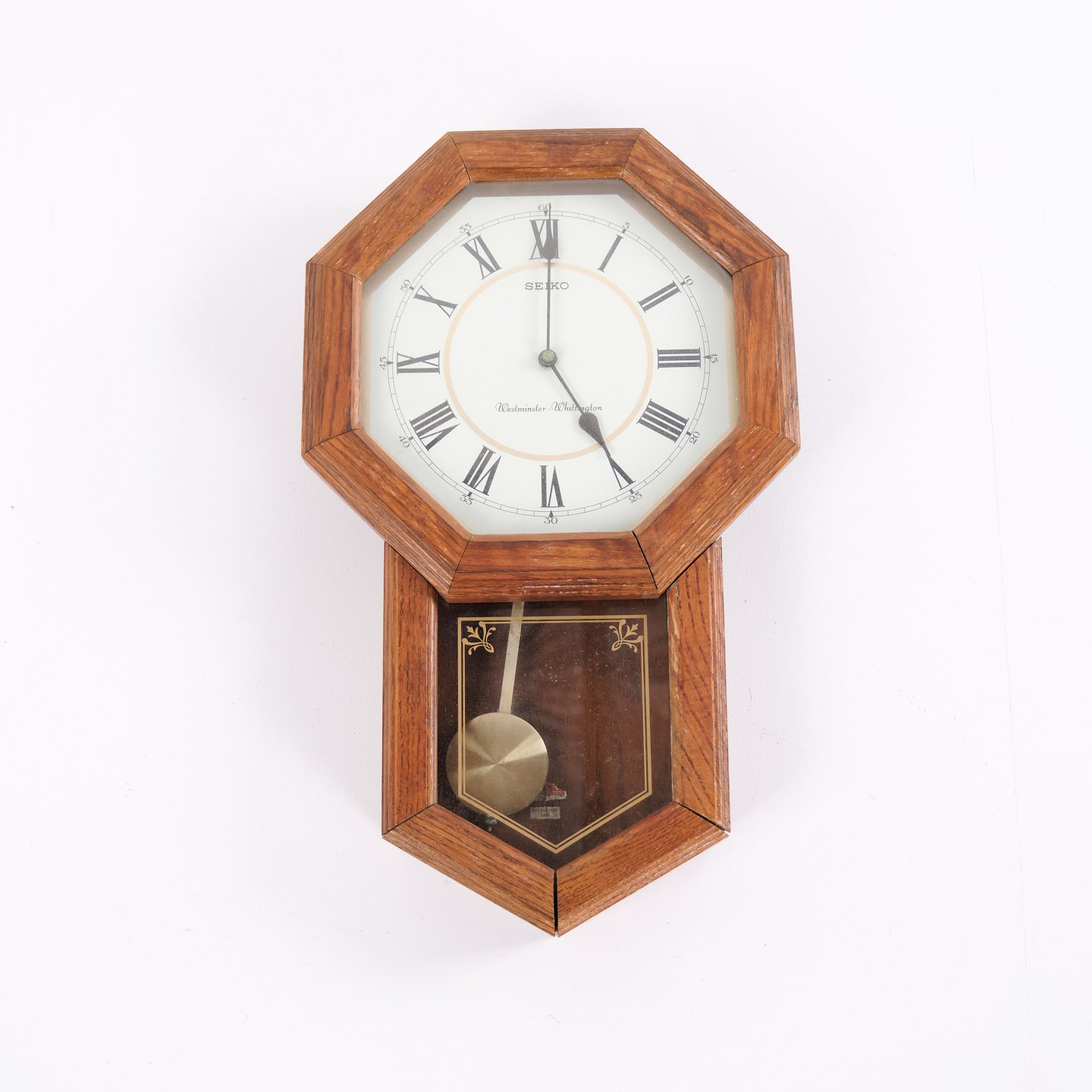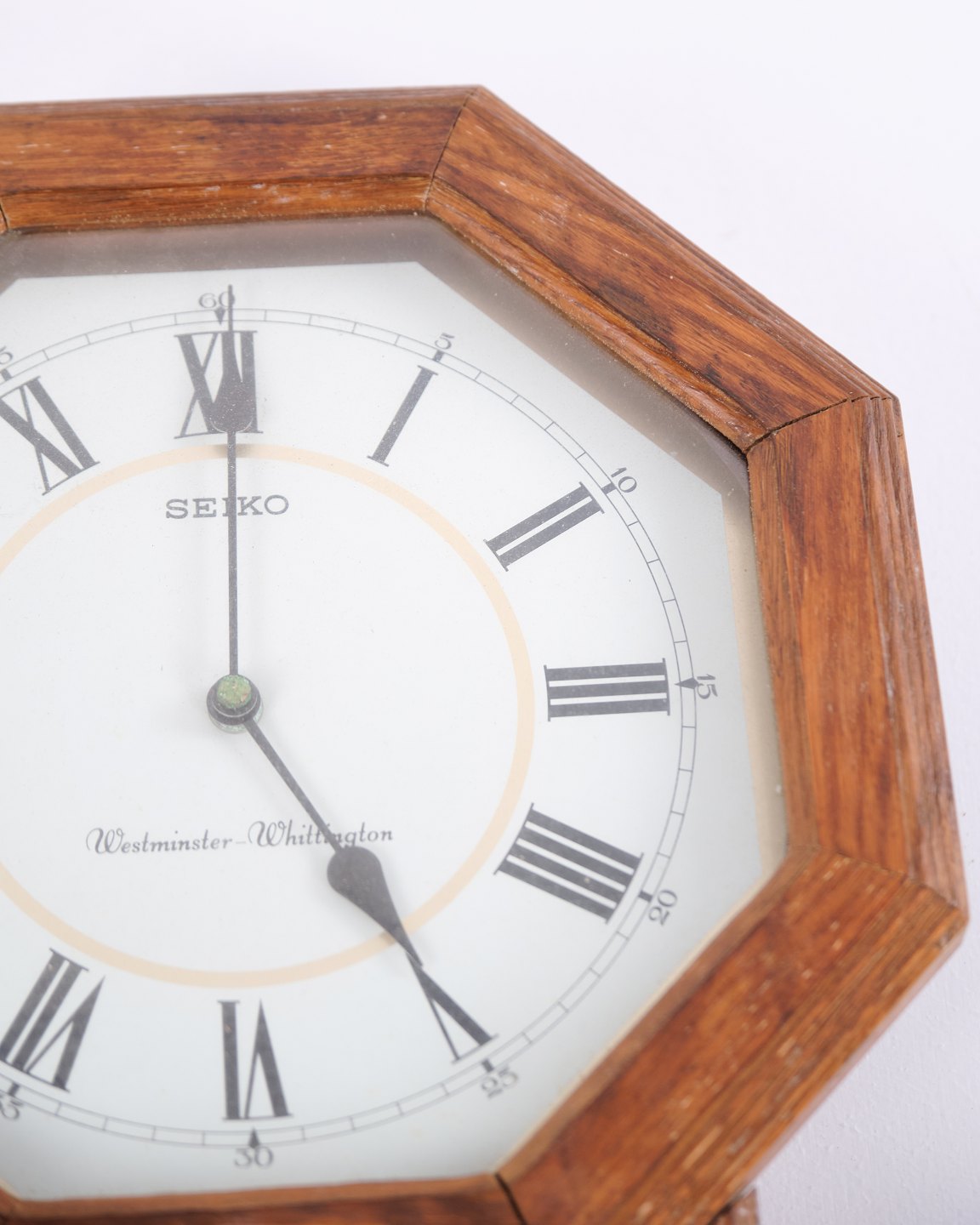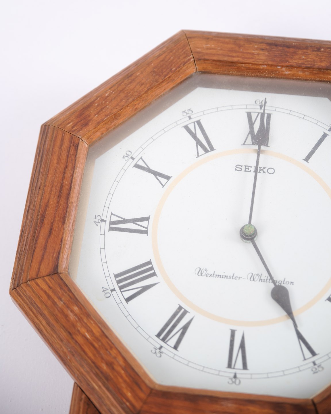 Wanduhr von Seiko mit Westminster- und Whittington-Gongmelodien. Aus Eichenholz gefertigt, mit klassischer Front und gut lesbarem Zifferblatt. Eine hochwertige Uhr mit präzisem Laufwerk und zeitlosem Ausdruck.