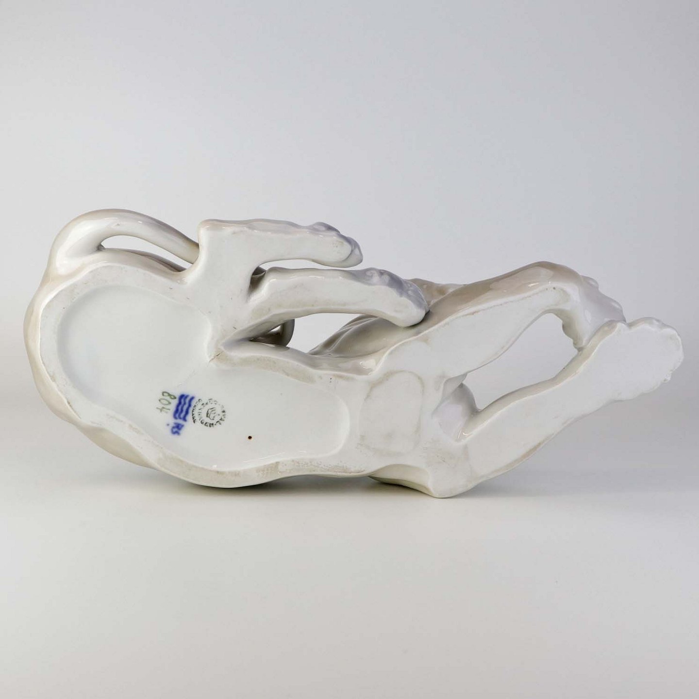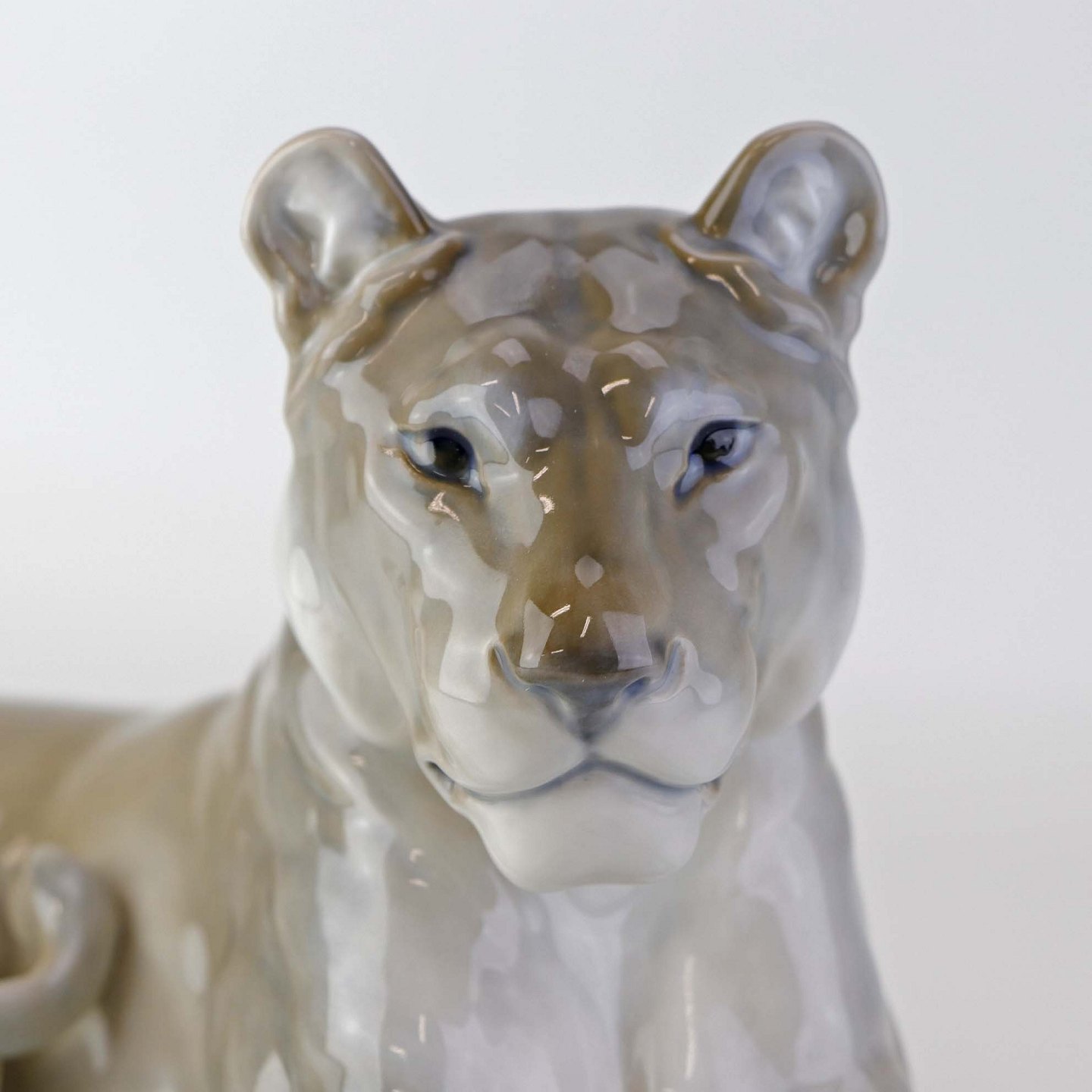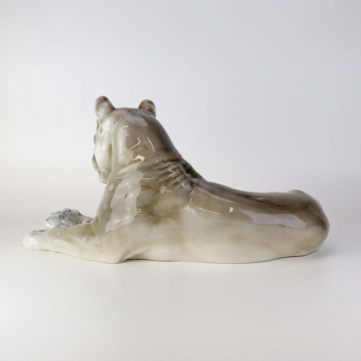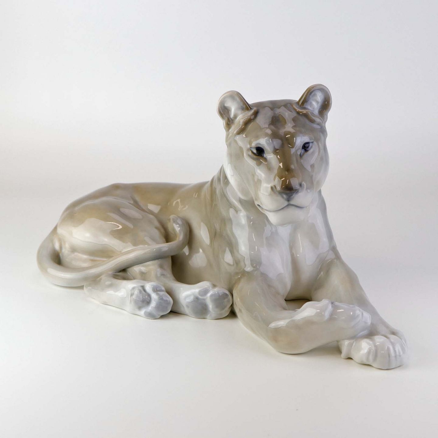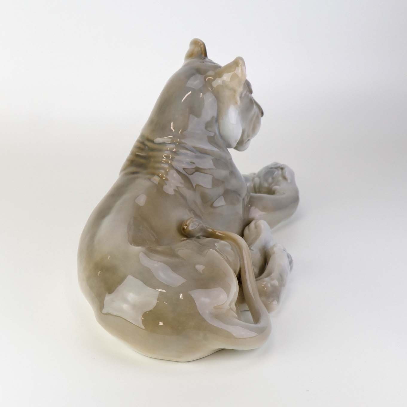 Figur i porcelæn med motiv af hvilende løvinde. Nr. 804