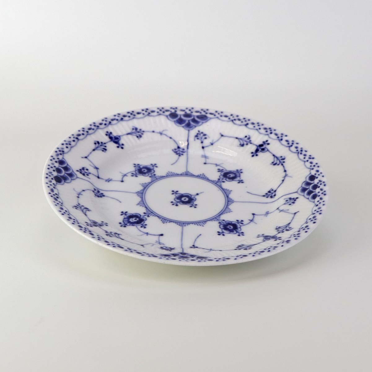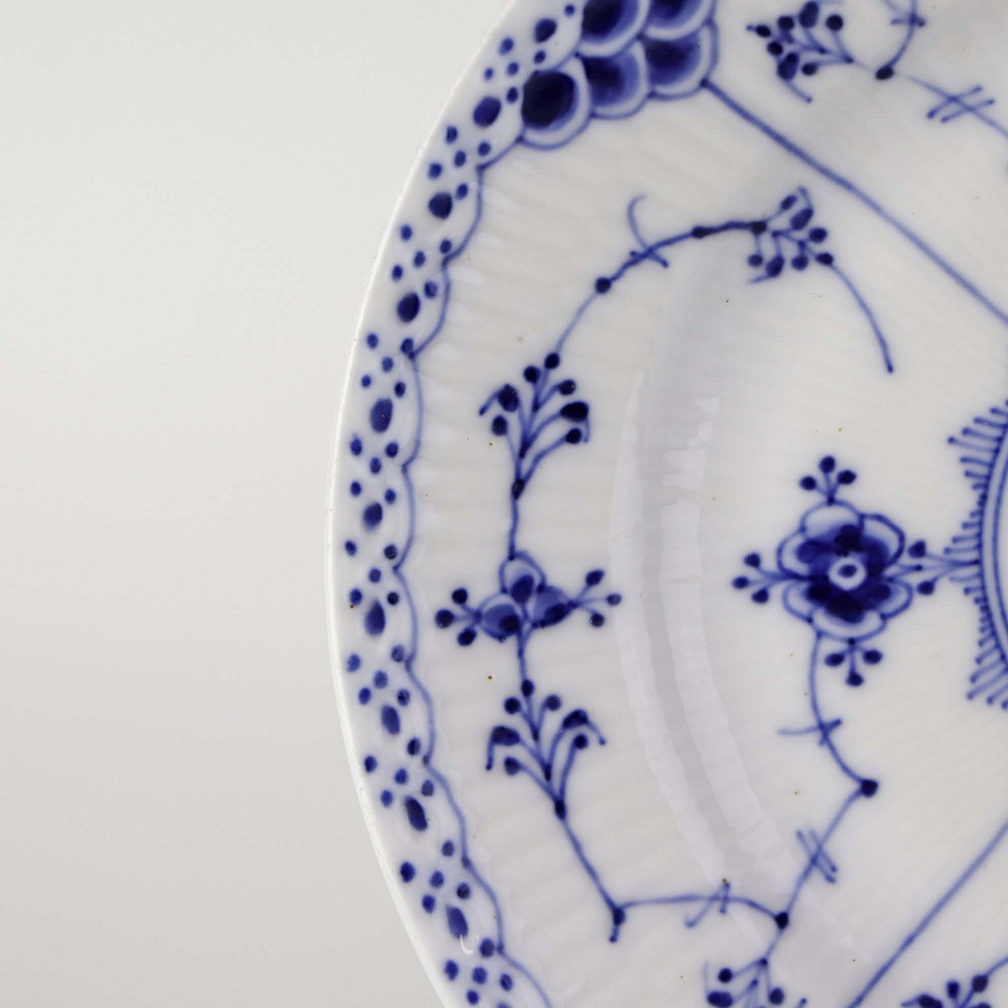 Musselmalet halvblonde er riflet hvidt porcelæn med dekoration af blå ranker og en kant med blonder.