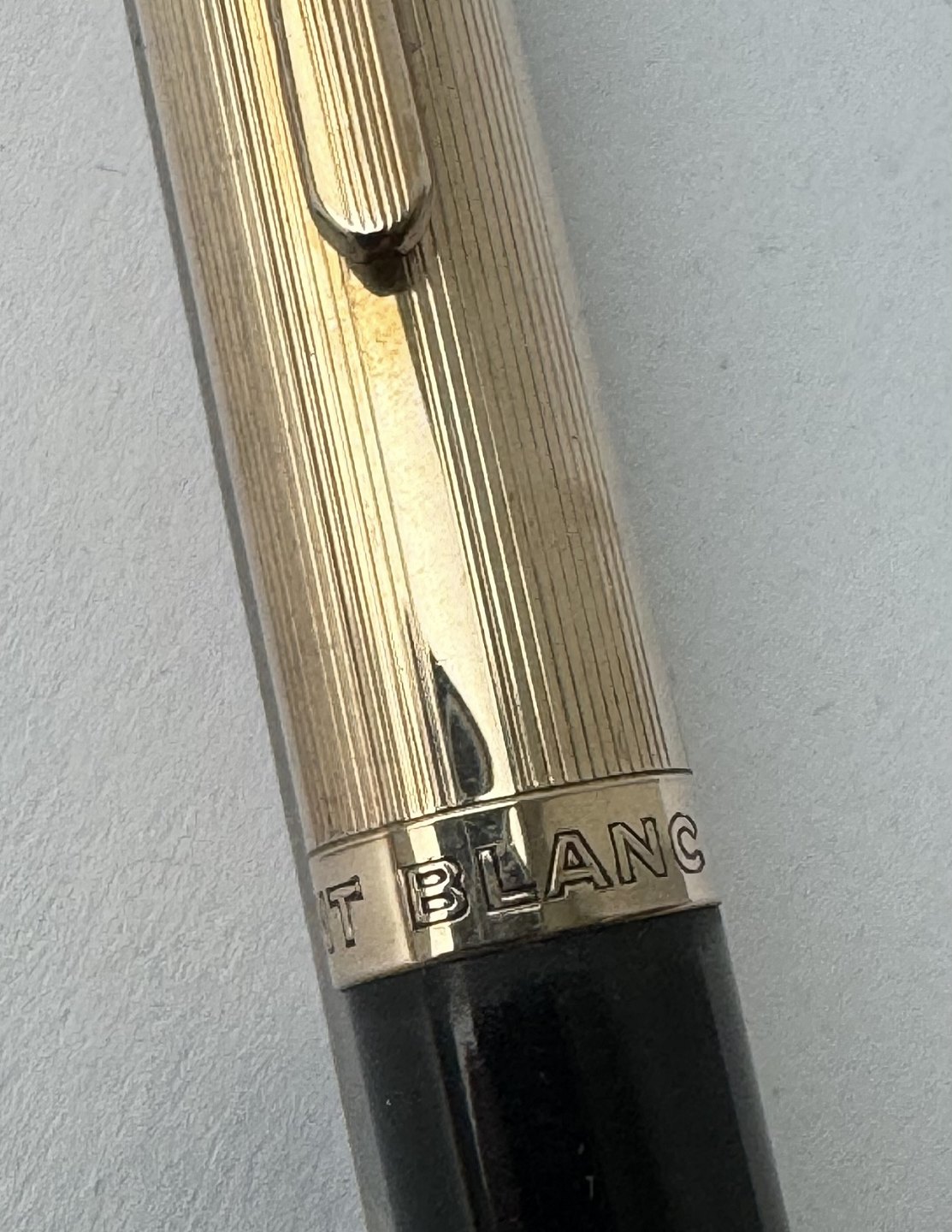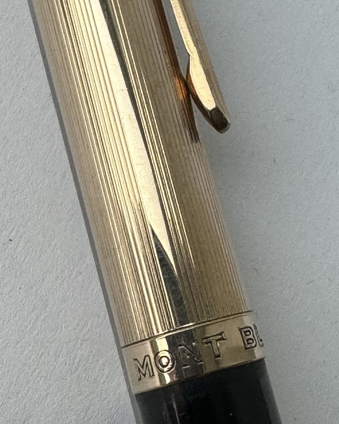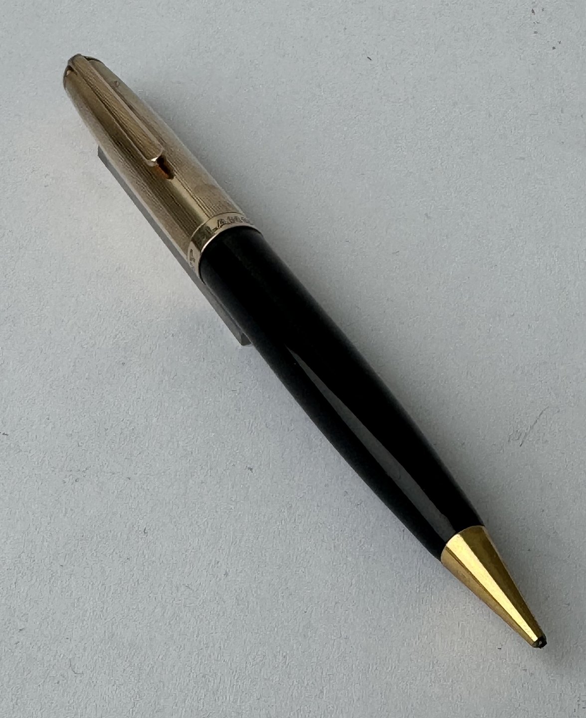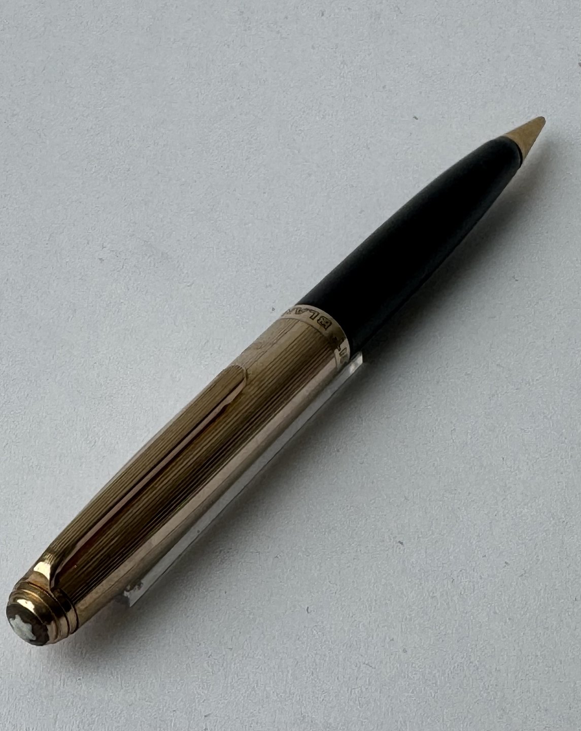 Sort Montblanc skrueblyant / stiftblyant / pencil med guld double top. I god og skriveklar stand. Længde 12,4 cm