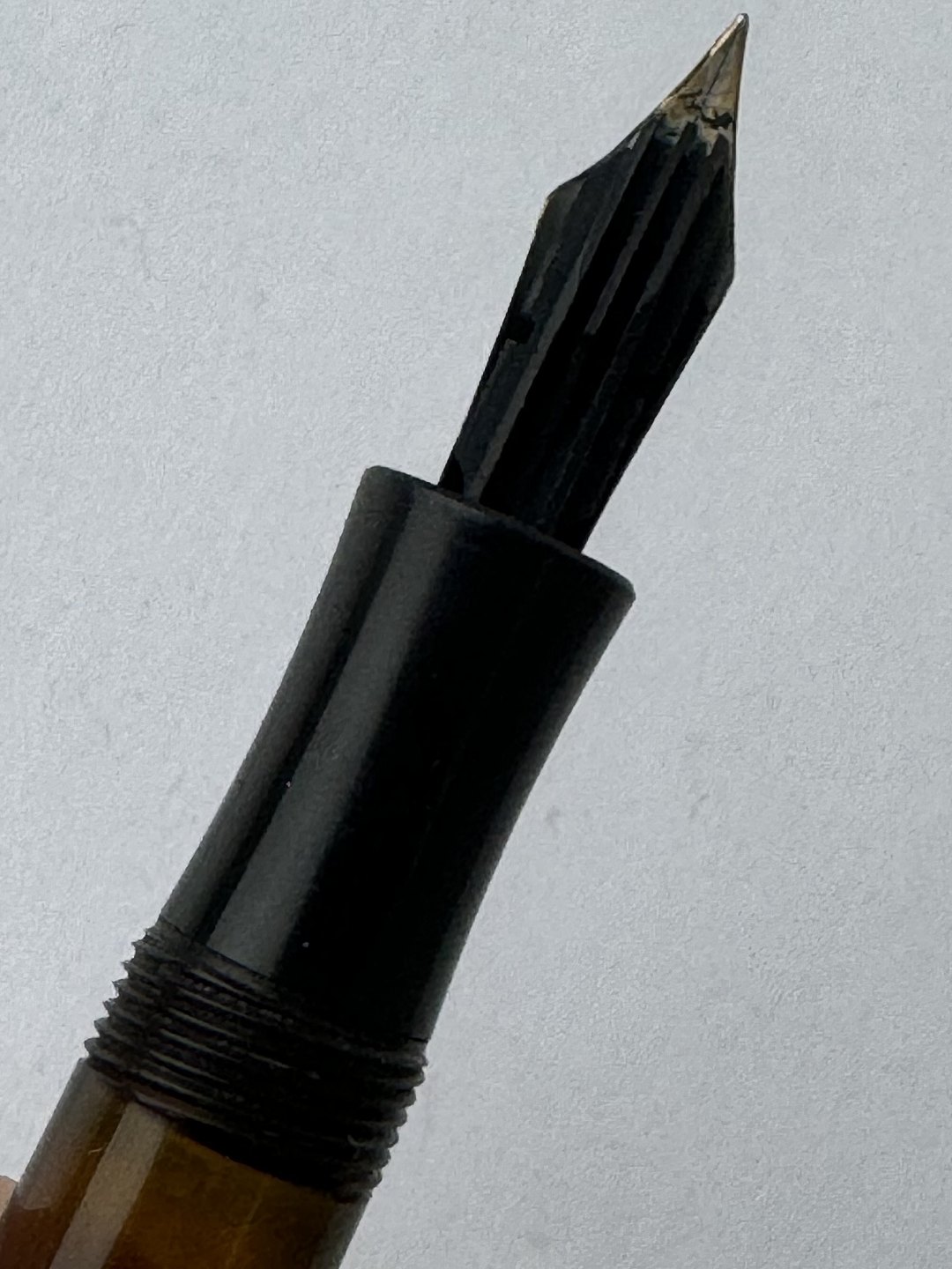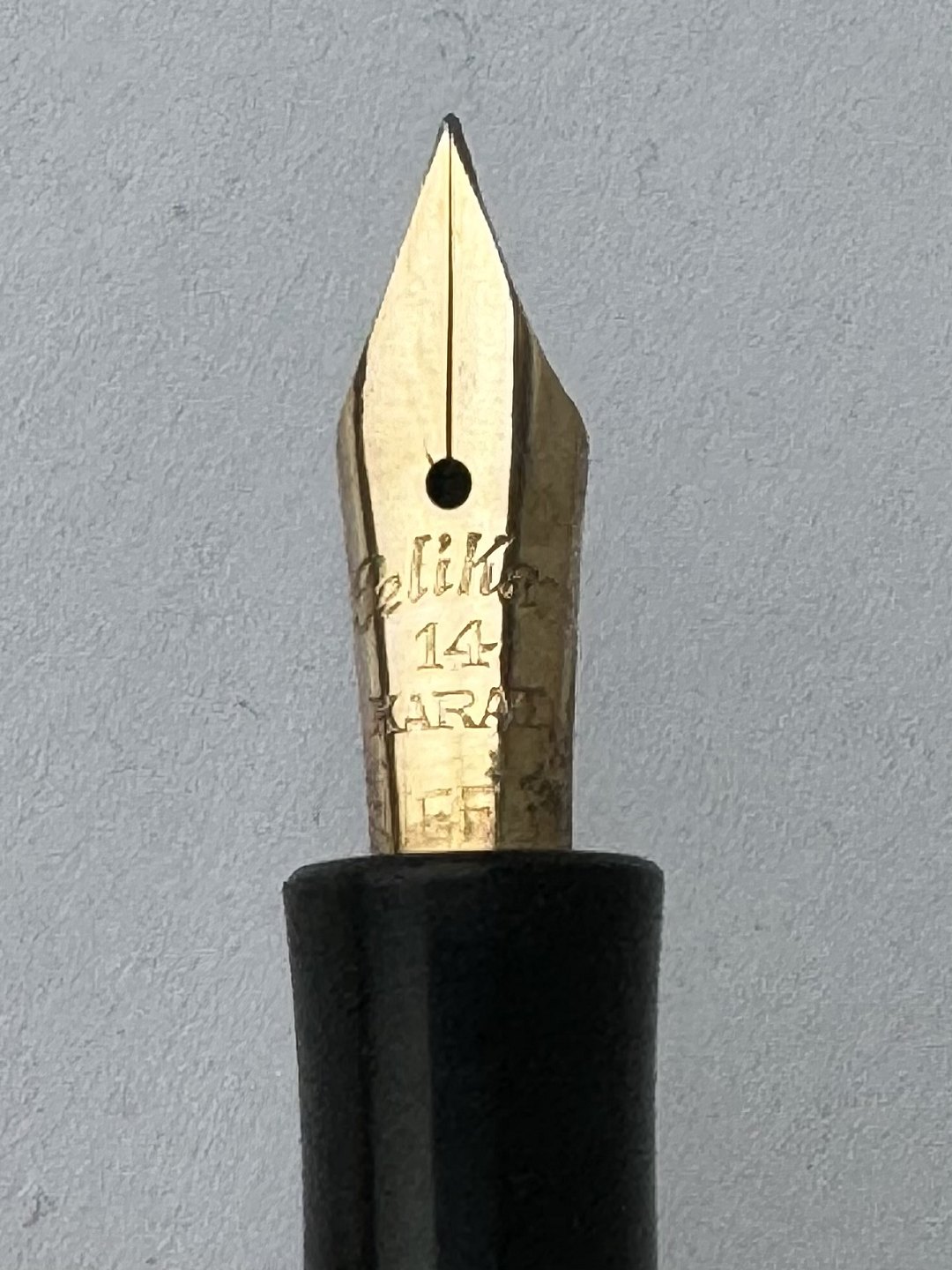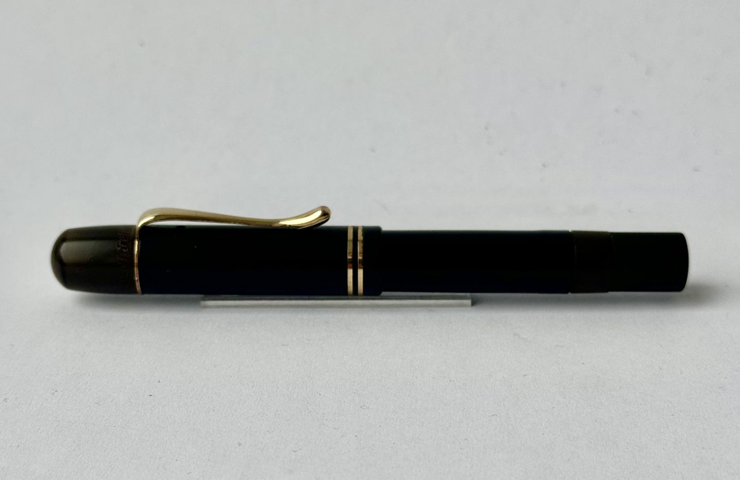 Sort Pelikan 100 fyldepen fremstillet i Tyskland midt i 1930’erne. Piston blækpåfylder. Fremstår i god stand uden skader eller reparationer. Alle dele originale til denne model inklusiv en 14 karat guldspids.