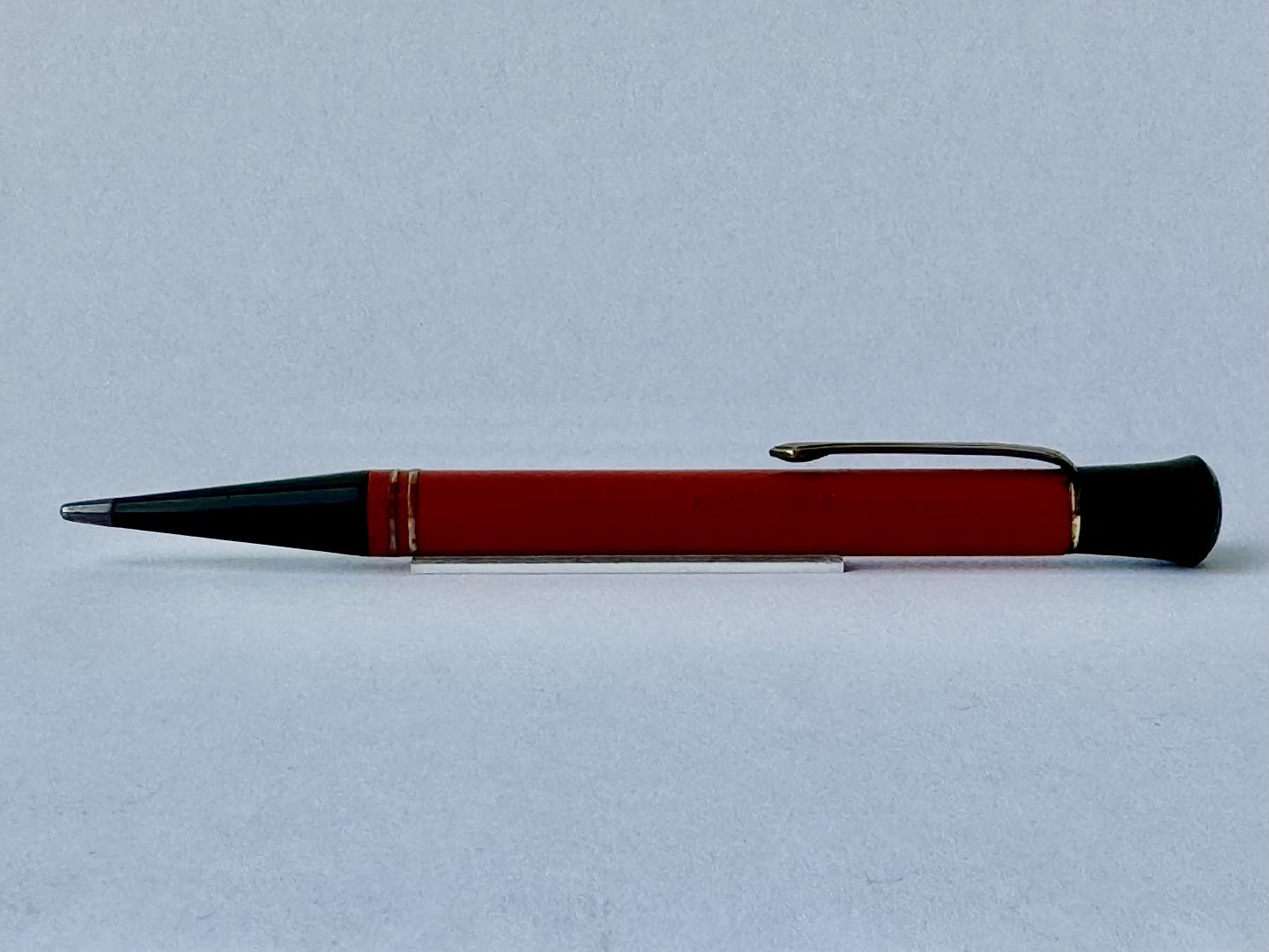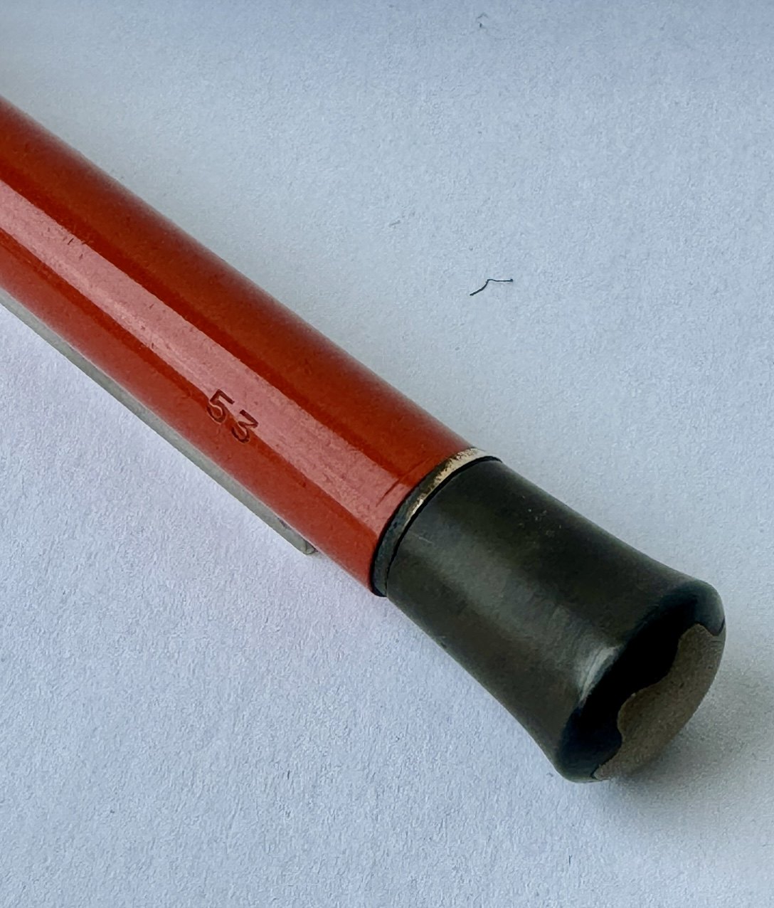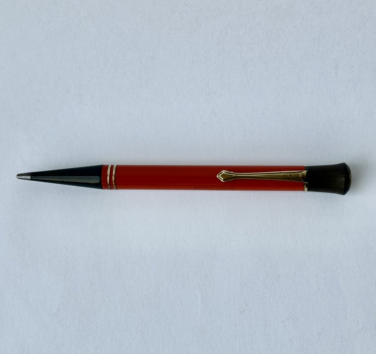 ART DECO PERIODEN: Koralrød Montblanc nr. 53 skrueblyant med stor indsat ben-hvid stjerne på toppen. Fremstillet i 1920’erne. Funktionsduelighed: Blyantsspidsen kan skrues ud, men skal have hjælp til at blive skruet tilbage. Skrues ikke naturligt tilbage når der drejes kontra på toppen. Indprentet Fabriksnavn MONTBLANC samt modelnummer 53. I god stand uden skader. Mål: 13,4 cm lang
