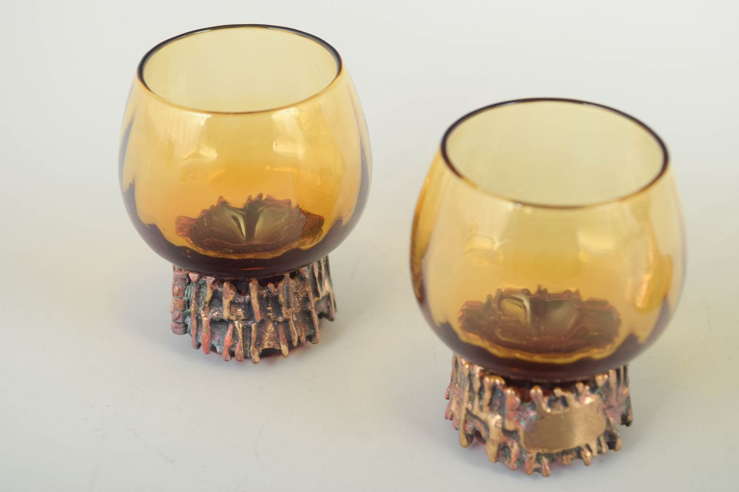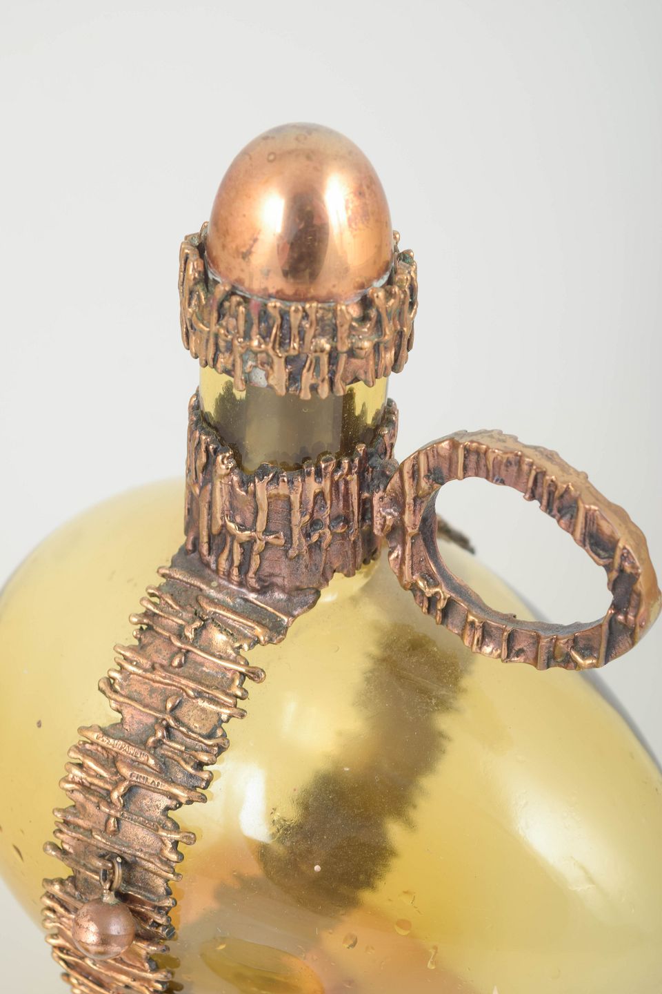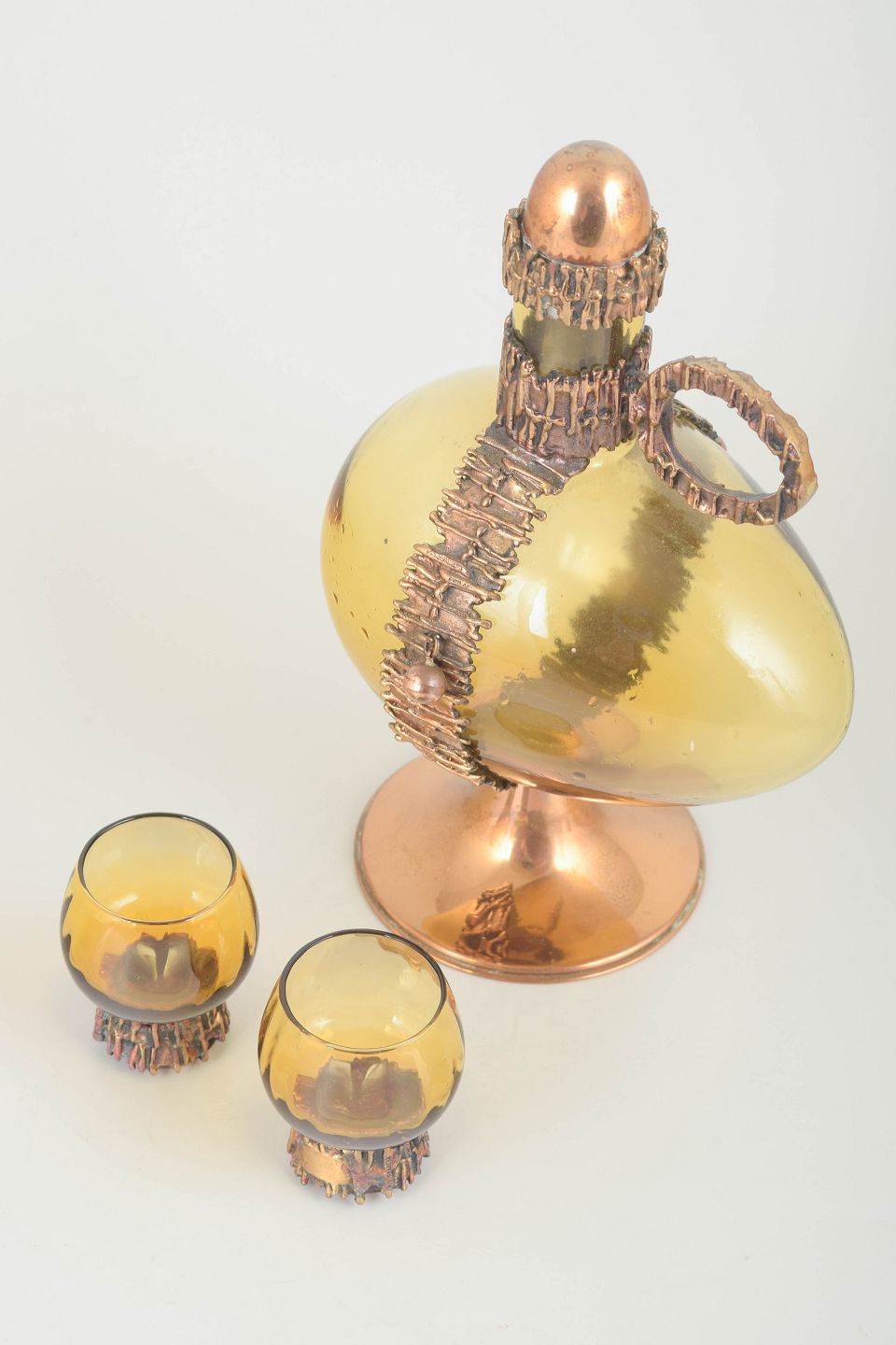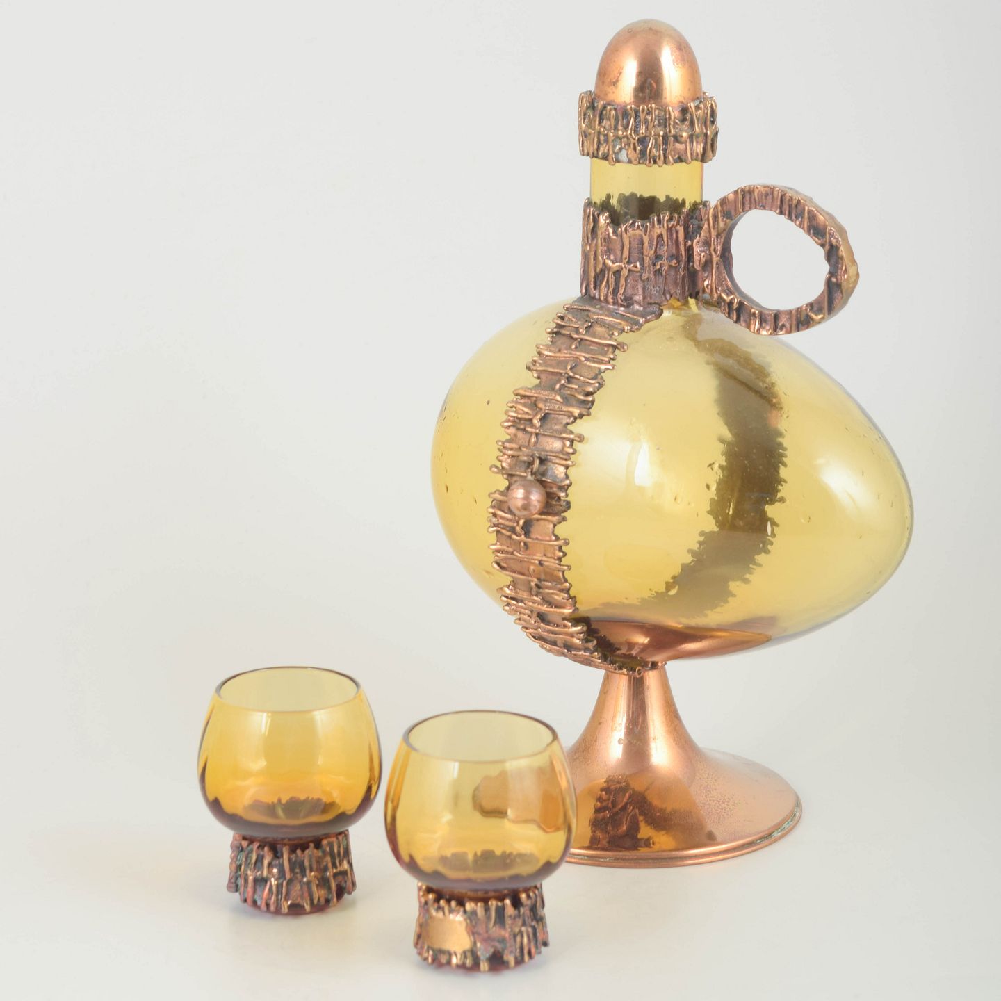 Skulpturel karaffel i røgfarvet glas med karakteristiske bronze-/kobberbeslag og rå teksturer, ledsaget af to matchende glas.