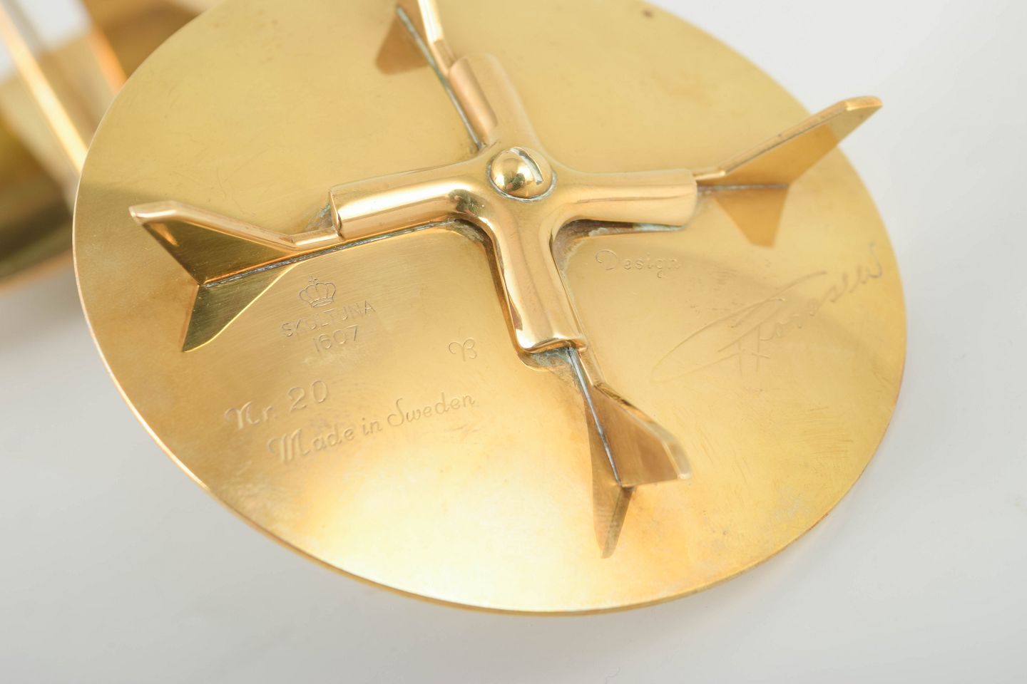Elegant og skulpturel formgivning i massiv messing med karakteristiske geometriske elementer, typisk for Forsells modernistiske udtryk for Skultuna.