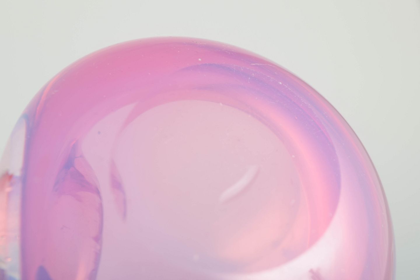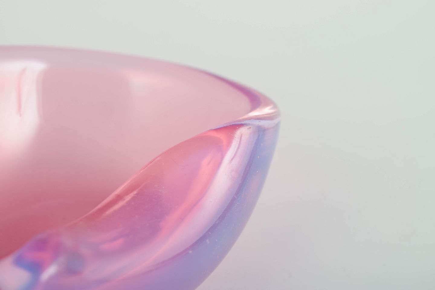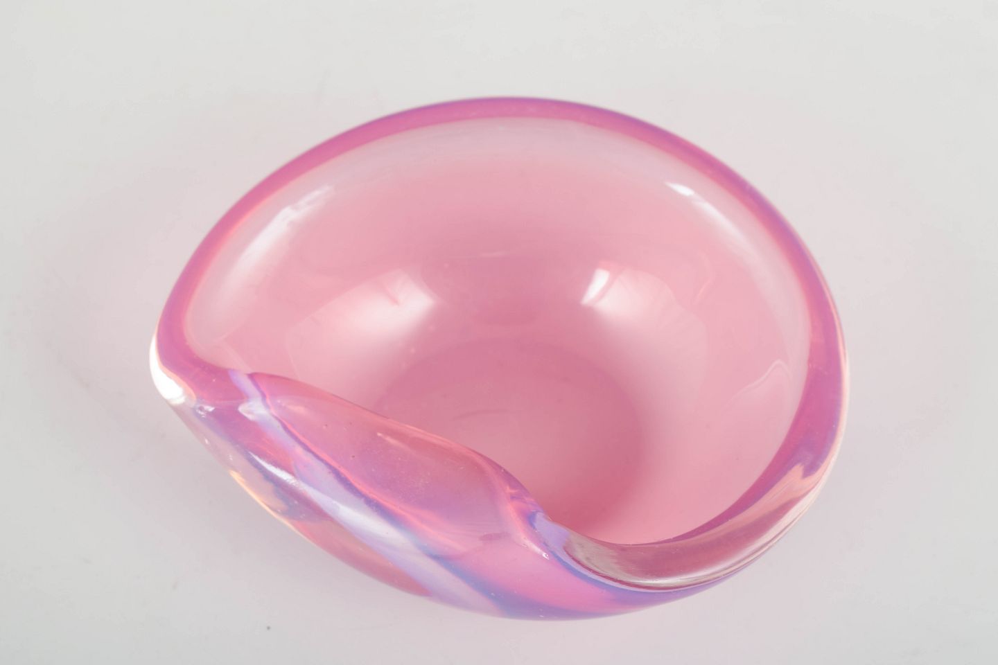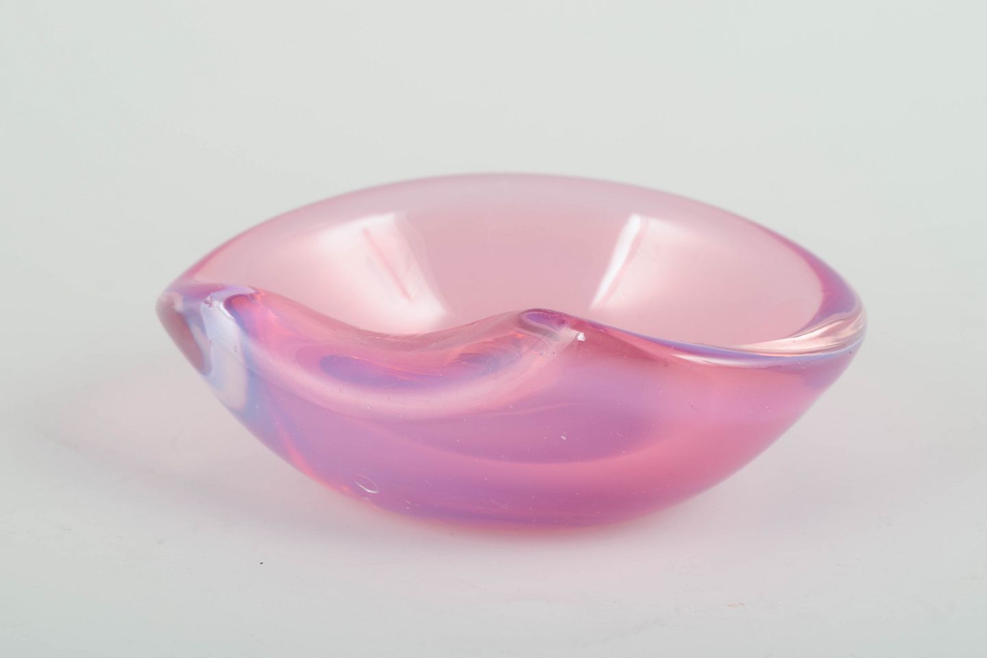 Lille, organisk formet skål i mundblæst glas med bløde kurver og delikat farvespil i rosa og lavendeltoner, typisk for Murano glas fra perioden.