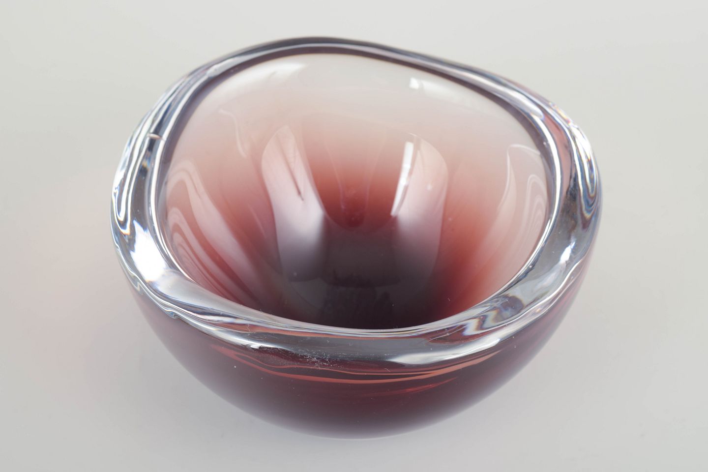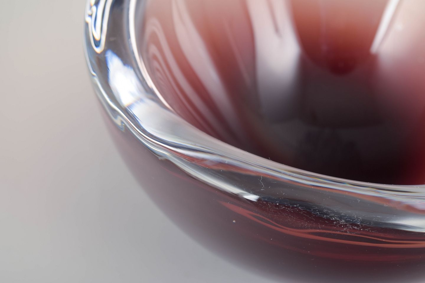 Organisk formet skål i mundblæst glas med lagdelt farvespil i dybe rubin- og klare toner, typisk for Murano-glas fra perioden.