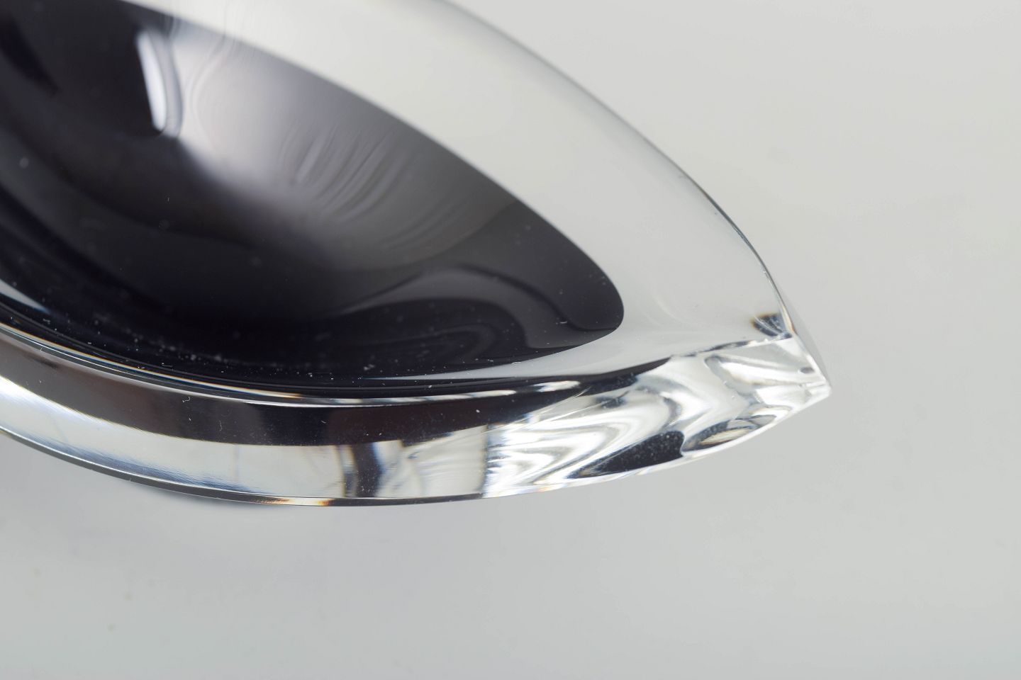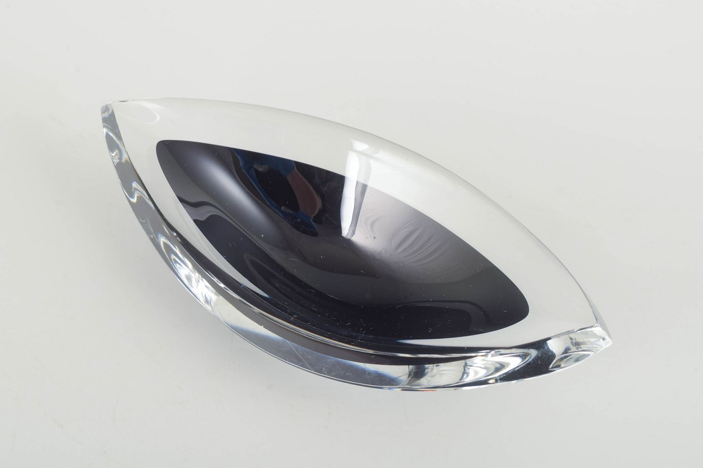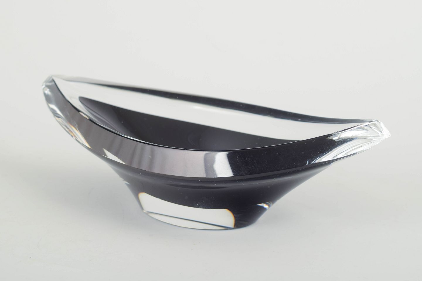 Mundblæst skål i klart og sort glas med elegant, bådformet silhuet og polerede flader, der skaber smukke lysrefleksioner.